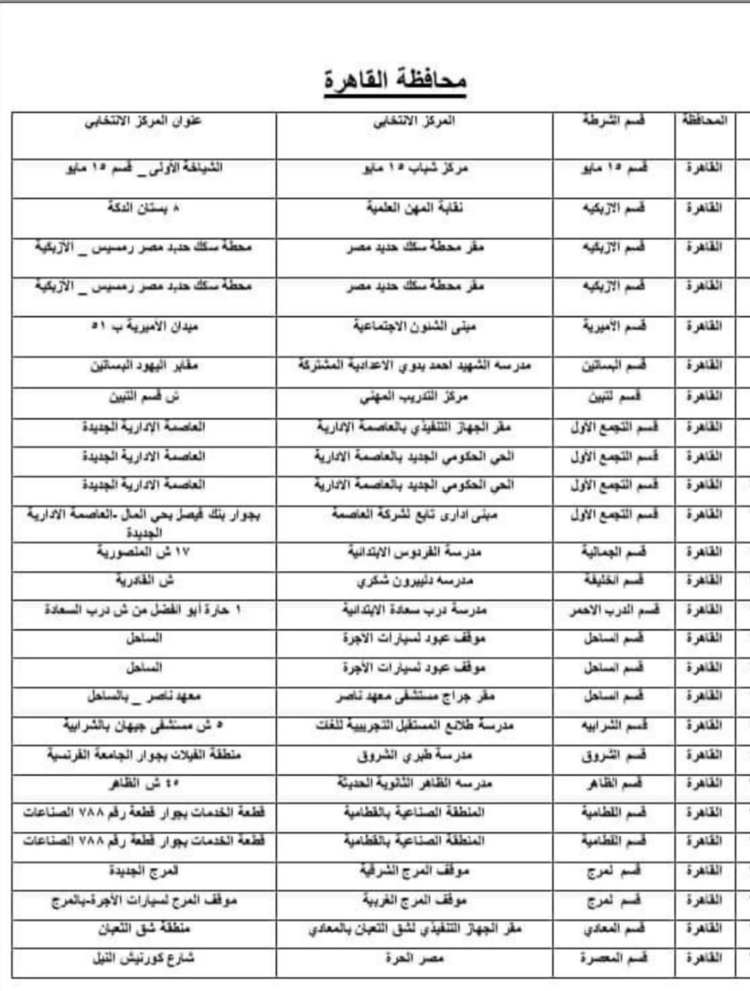 جاء بيان إحصائي بعناوين لجان الوافدين بمحافظه القاهرة وغير مقيدين محل إقامتهم، حسب الرقم القومي بمحافظة القاهرة؛ ويضم 26 مركز انتخابي بالمحافظة للمغتربين، على النحو الآتي: