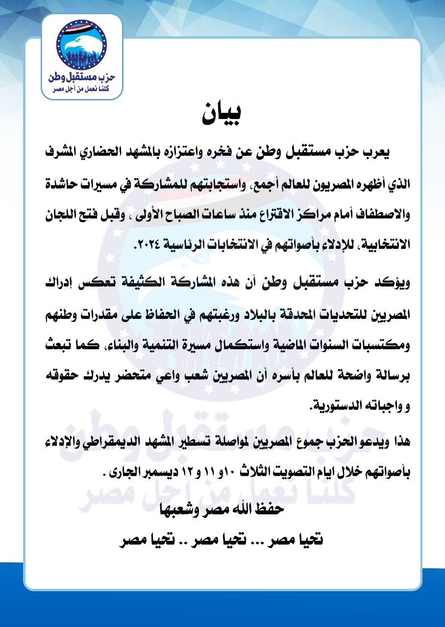 أعرب حزب مستقبل وطن عن مدي فرحه بالمشهد الحضاري الذي اظهره المصريين للعالم اجمع واستجابتهم للمشهد العظيم والاصطفاف امام لجان الاقتراع