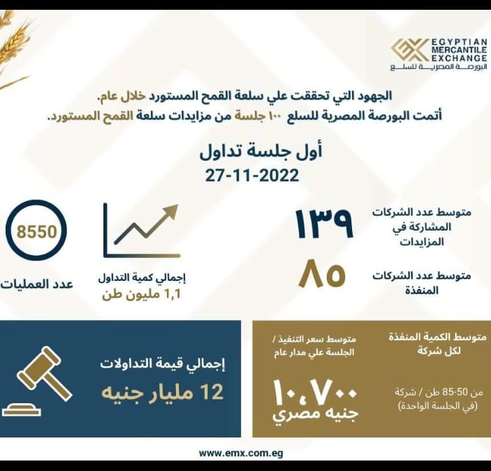 وأضاف في تصريحات له اليوم، أن إجمالي عدد جلسات التداول بلغ 100 جلسة من مزايدات على القمح بمعدل جلستين في الاسبوع (الأحد والأربعاء)،وتم التنفيذ من خلال 8550 عملية، فيما بلغ عدد الشركات المسجلة نحو 139 شركة وبلغ متوسط عدد الشركات المنفذة نحو 85 شركة.
