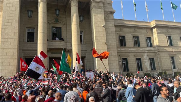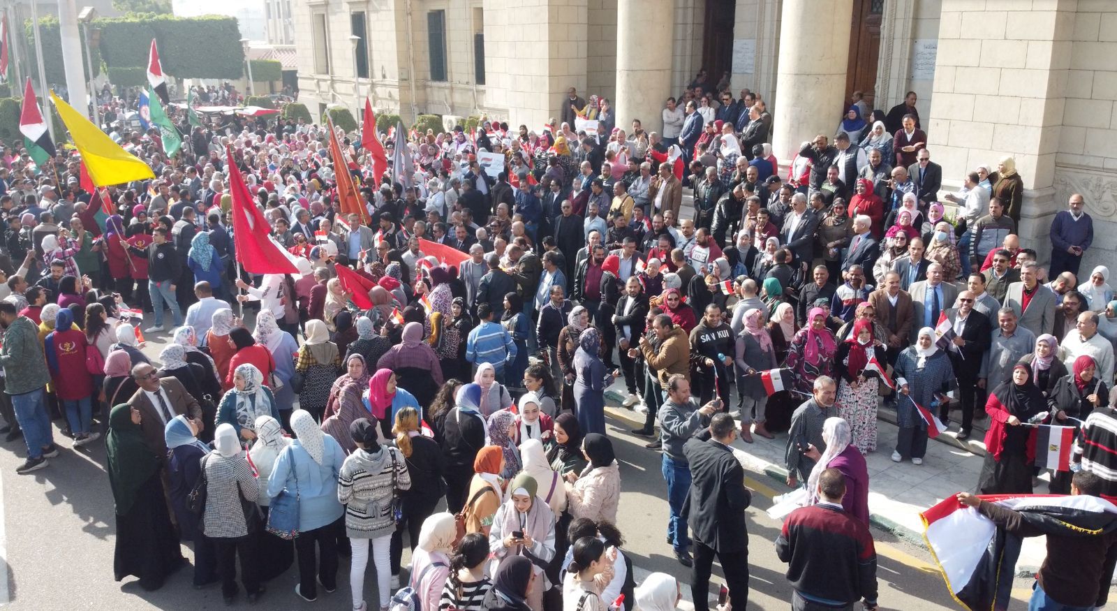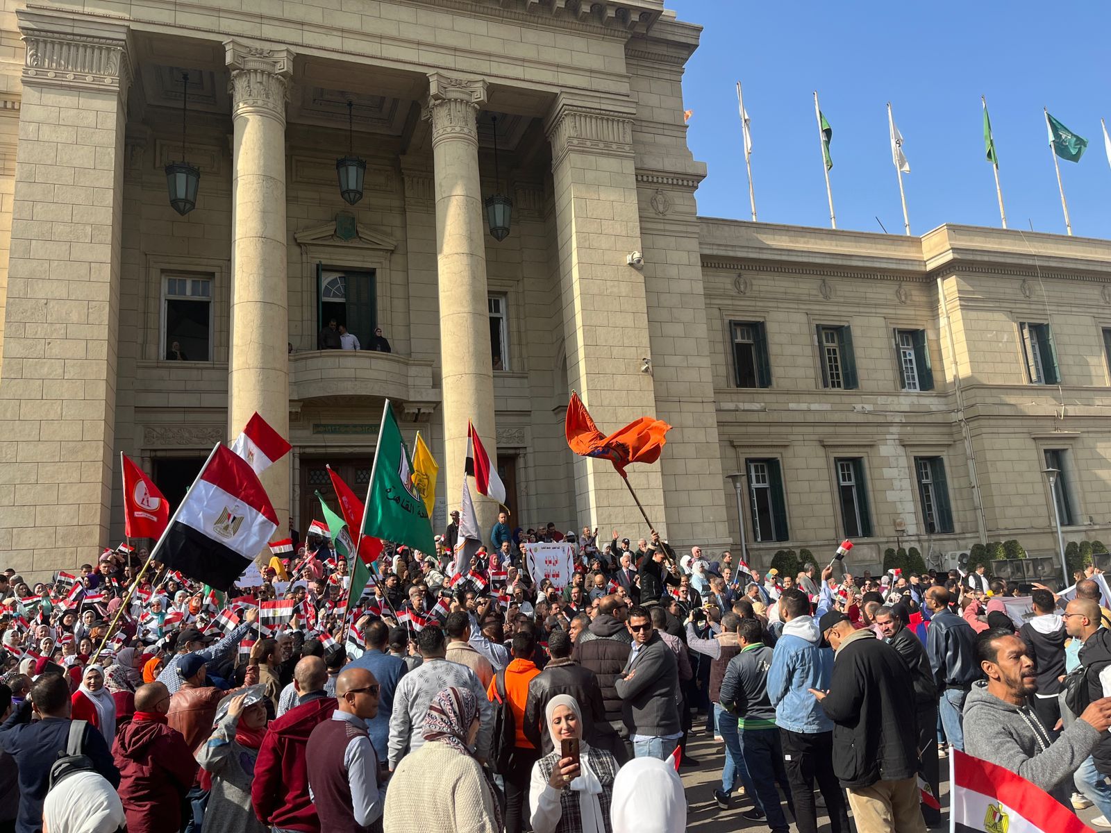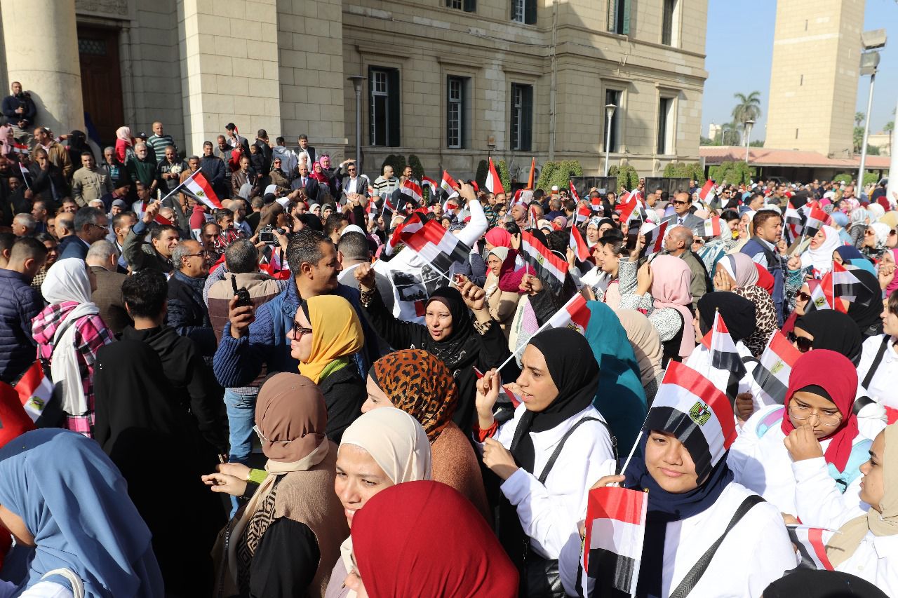 ورفعت حشود جامعة القاهرة من أعضاء هيئة التدريس وعمداء ووكلاء الكليات ورؤساء الأقسام، والطلاب، والعاملين ومديري الإدارات، أعلام مصر وسط هتافات كبيرة احتفالًا بمشاركتهم في الاستحقاق الدستوري المهم الذي يحدد مستقبل الوطن.