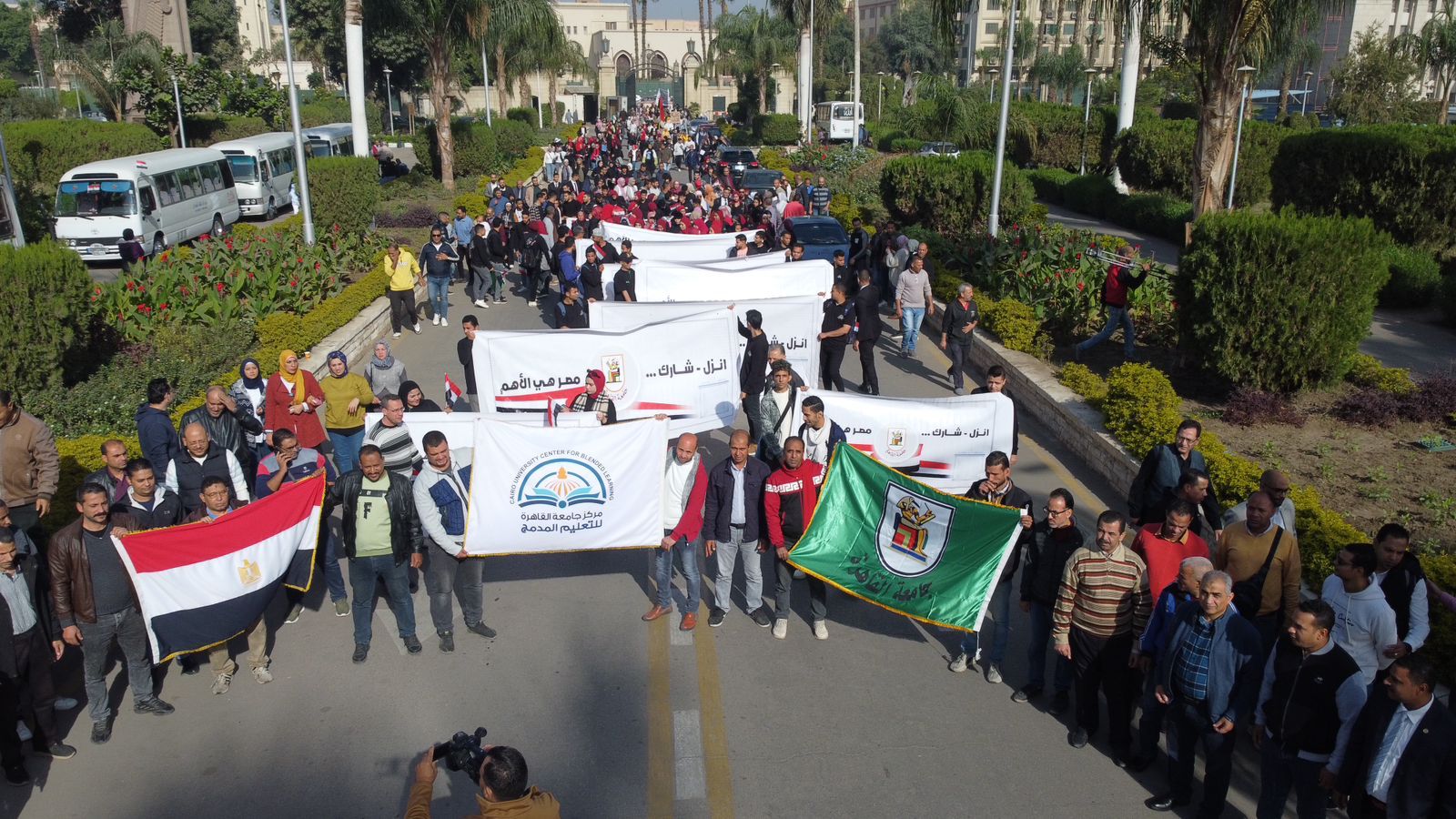 على أنغام نشيد "قالوا إيه علينا دولا .. قالوا إيه"، هتف منتسبي جامعة القاهرة خلال مشاركتهم في المسيرة الحاشدة التي انطلقت من الجامعة للمشاركة الإيجابية في الانتخابات الرئاسية 2024، تحت شعار انزل شارك .. مصر هي الأهم، والتي بدأت أمس 10 ديسمبر وتستمر حتى الثلاثاء وفقًا للجدول الزمني المقرر من الهيئة الوطنية للانتخابات.