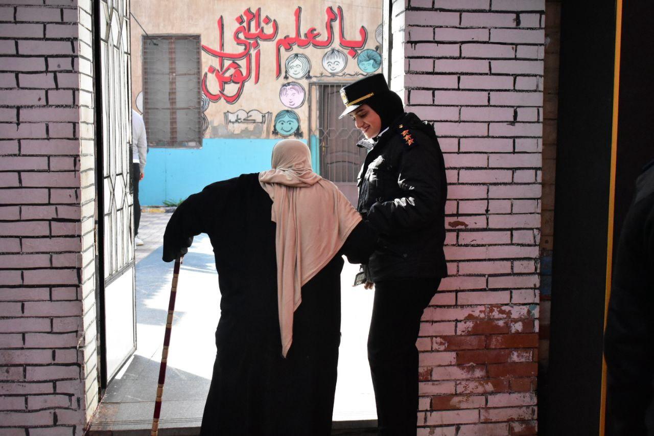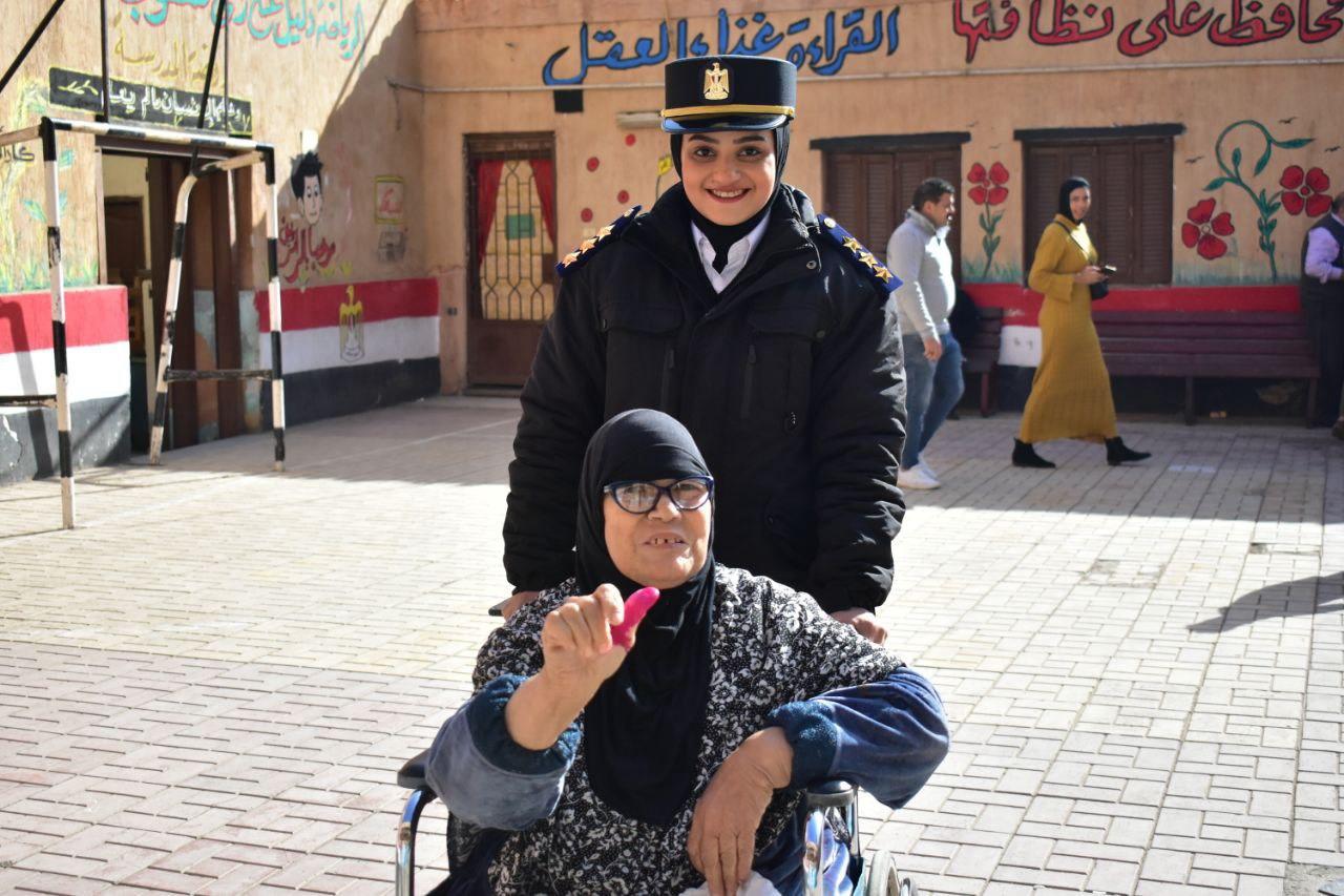 الشرطة النسائية تساعد كبار السن خلال إدلائهم بأصواتهم بلجنة بمدرسة أبوالفرج بولاق ابوالعلا