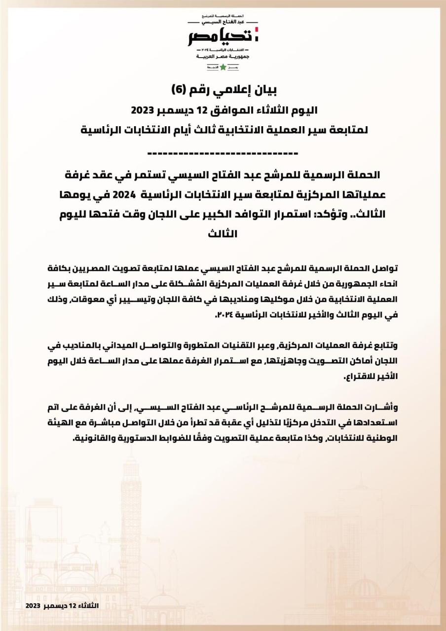 حملة السيسي تتابع سير العملية الانتخابية ثالث أيام الانتخابات الرئاسية 2024