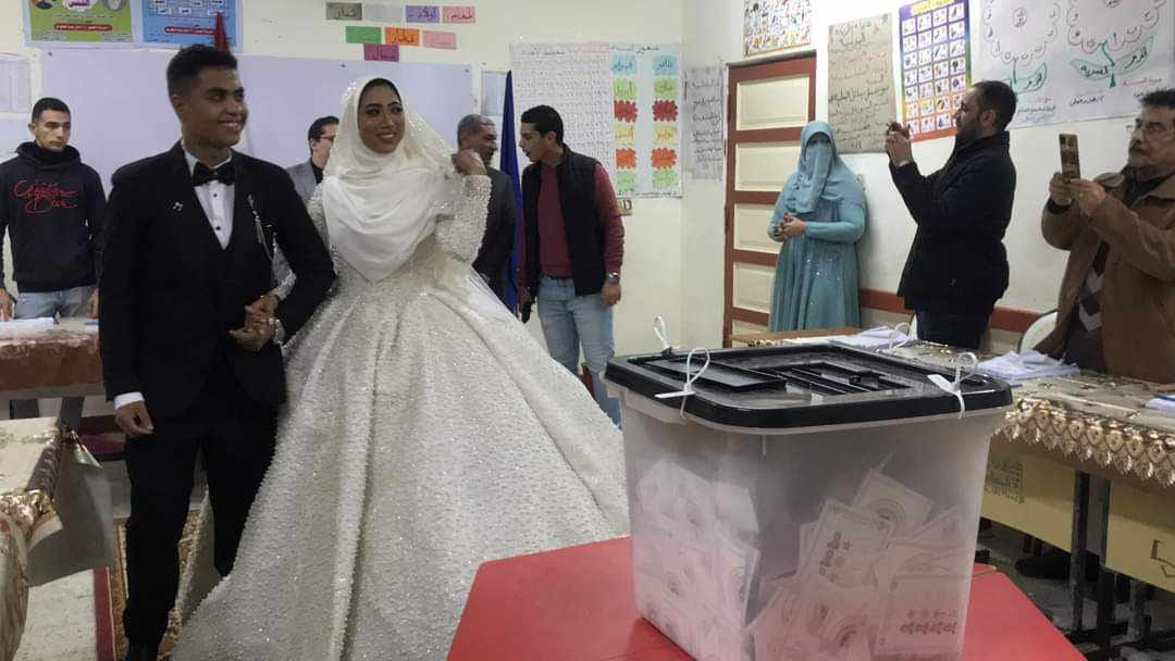 بملابس الزفاف.. عروسان يدليان بصوتهما في الساعات الأخيرة من الانتخابات الرئاسية بالبحيرة