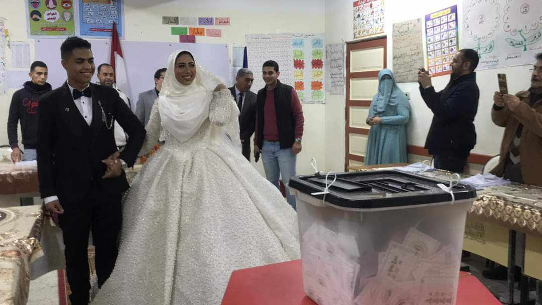 أدلى عريس وعروسة بصوتهما مساء اليوم الثلاثاء قبل إغلاق اللجان الإنتخابية فى أخرأيام عمليات التصويت للإنتخابات الرئاسية وتواجد العروسين وسط احتفالات كبيرة من الحضور والمشاركين فى العُرس الانتخابي أمام أحد صناديق الإقتراع بمحافظة البحيرة .