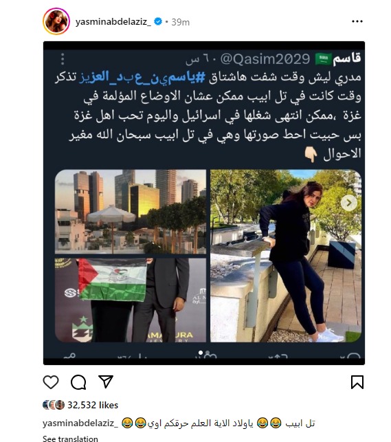 ياسمين عبد العزيز.. وقام بعض مستخدمي مواقع التواصل بنشر صور وصفوها بأنها لياسمين عبد العزيز أثناء زيارة قامت بها إلى تل أبيب، لترد ياسمين عبد العزيز على الصورة المفبركة قائلة "تل ابيب. ياولاد الإيه العلم حرقكم أوي". "