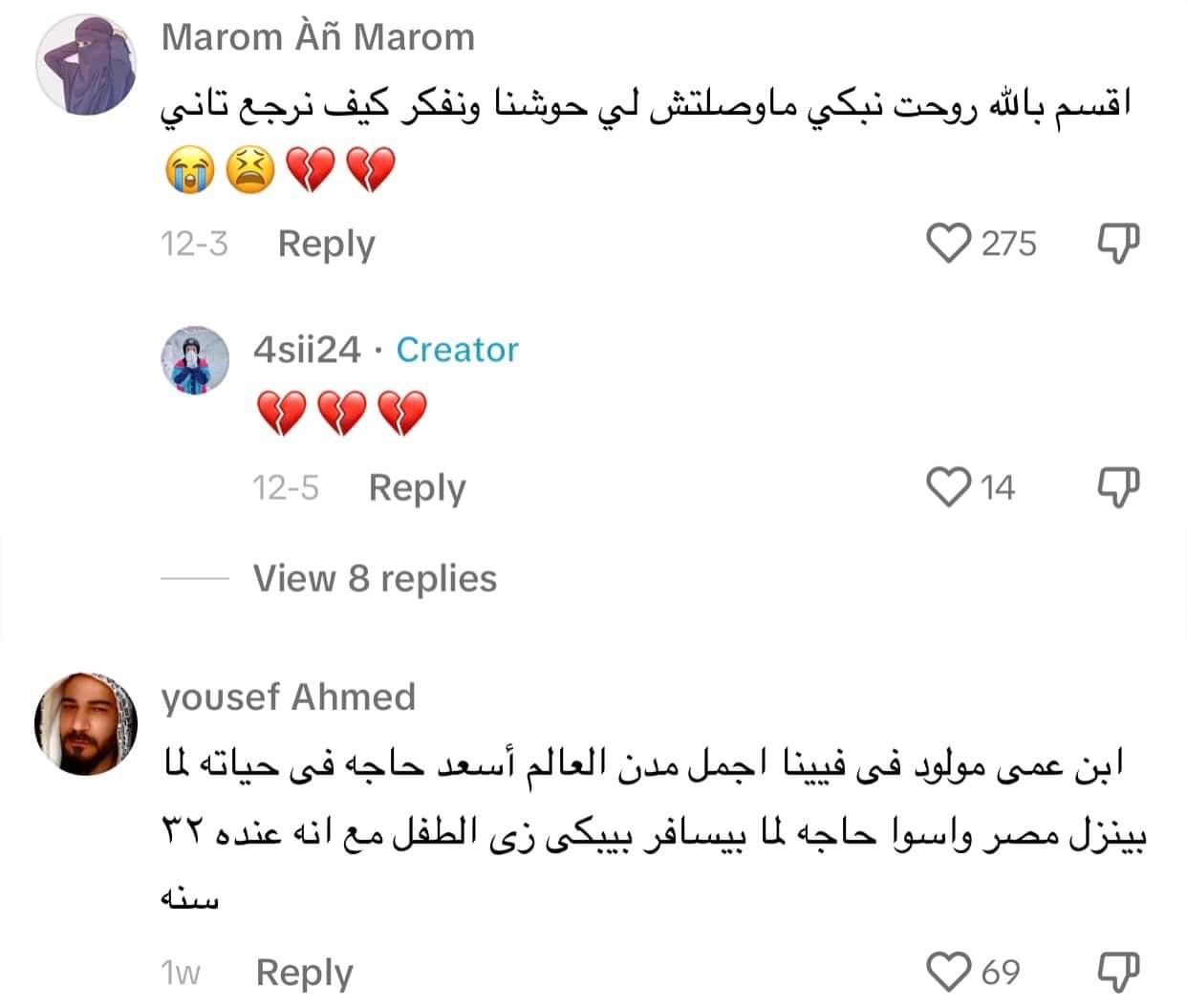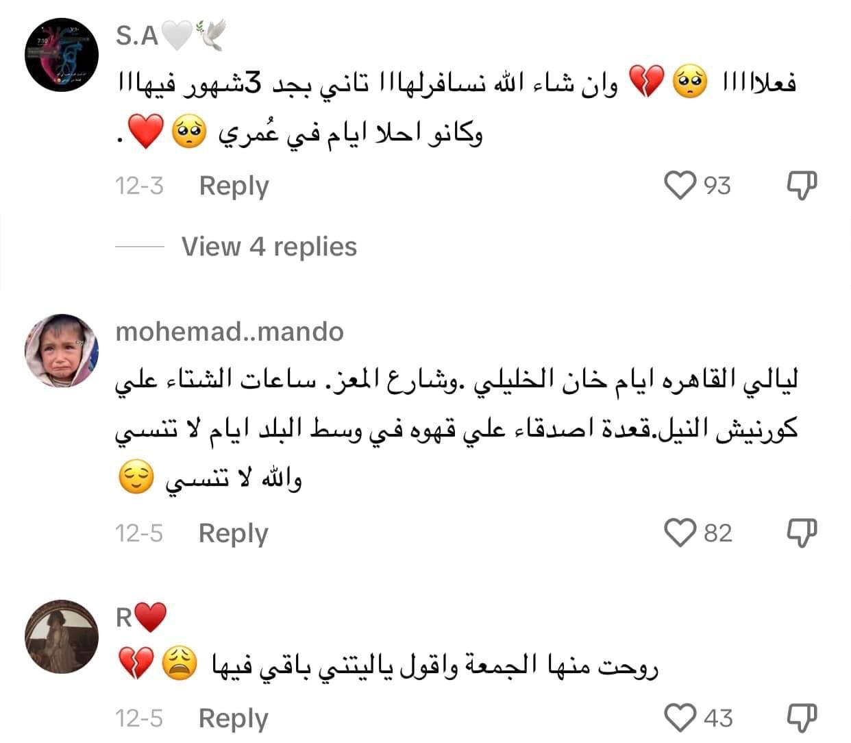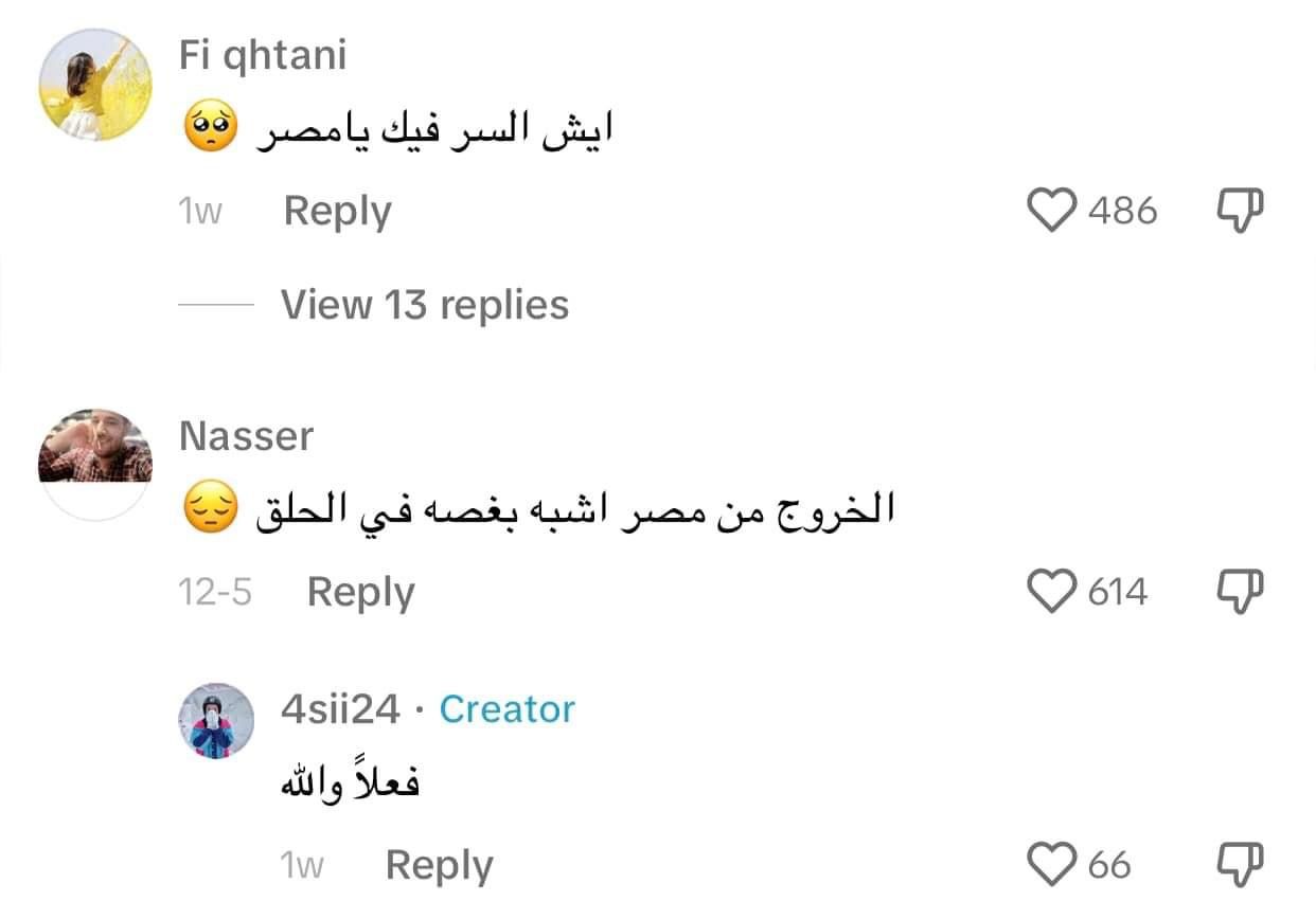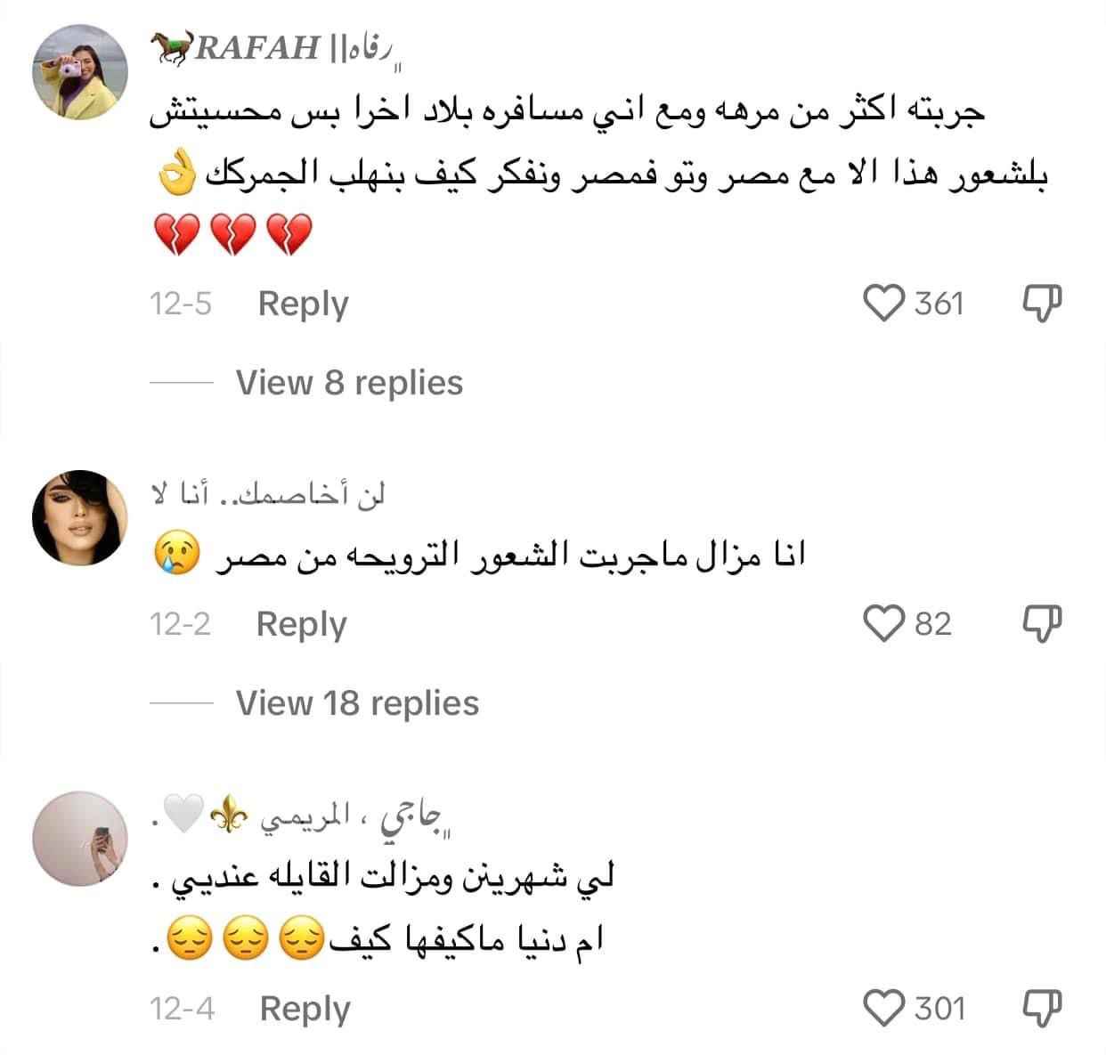 وقال أحدهم “ ابنى عمى مولود فى فيينا أجمل مدن العالم وأسعد لحظات حياته لما بينزل مصر ”، وقال تعليق آخر “ الخروج من مصر أشبه بغصه الحلق” ، وقال آخر" إيه السر فيكى يا مصر".
