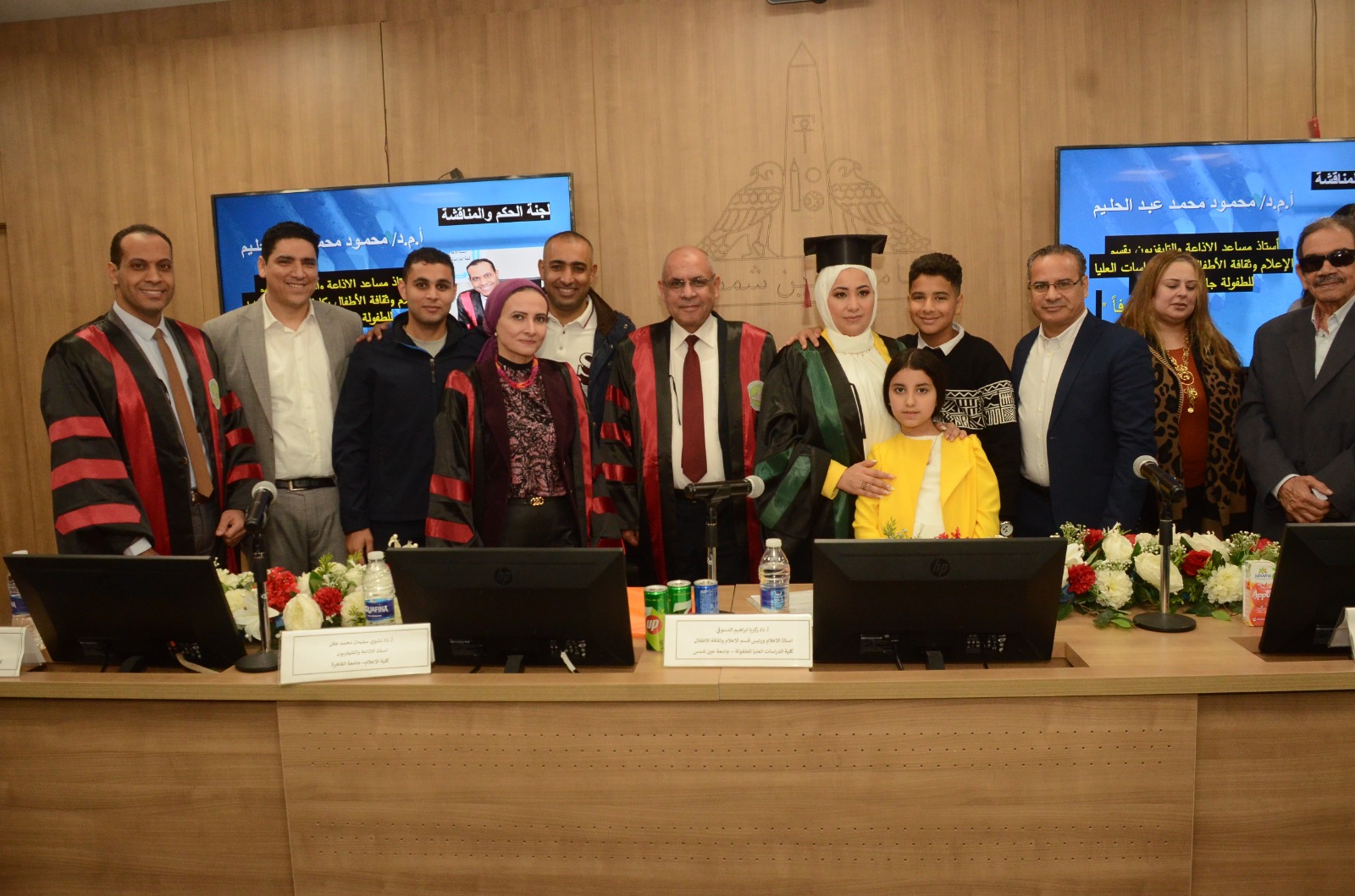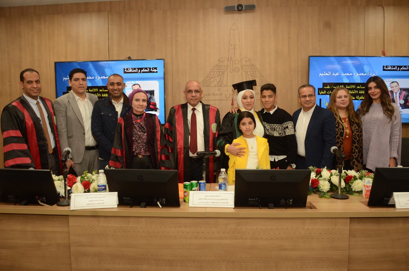 وتكونت لجنة الإشراف والمناقشة من كلا من: الدكتور زكريا إبراهيم الدسوقي، أستاذ ورئيس قسم الإعلام بكلية الدراسات العليا للطفولة جامعة عين شمس رئيسا ومشرفا، والدكتورة نشوى سليمان محمد عقل أستاذ الإذاعة والتليفزيون بكلية الإعلام جامعة القاهرة مناقشًا من الخارج.