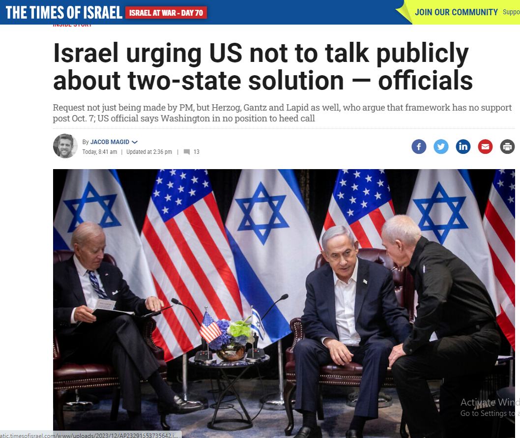نقلت صحيفة تايمز اوف إسرائيل ان القادة الإسرائيليون حثوا إدارة بايدن سرا على الامتناع عن الحديث علنا عن حل الدولتين في أعقاب الهجوم الذي شنته حماس في 7 أكتوبر،