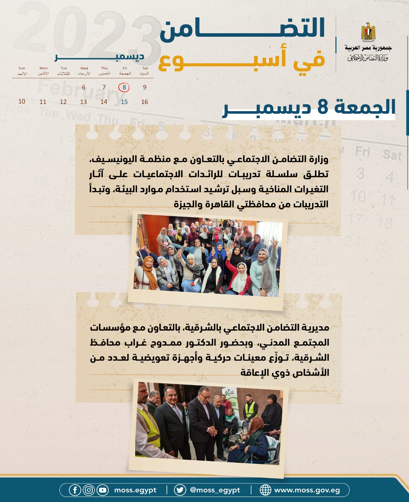 - وزارة التضامن الاجتماعي، بالتعاون مع منظمة اليونيسف، تطلق سلسلة تدريبات للرائدات الاجتماعيات علي آثار التغيرات المناخية وسبل ترشيد استخدام موارد البيئة، وتبدأ التدريبات من محافظتي القاهرة والجيزة.