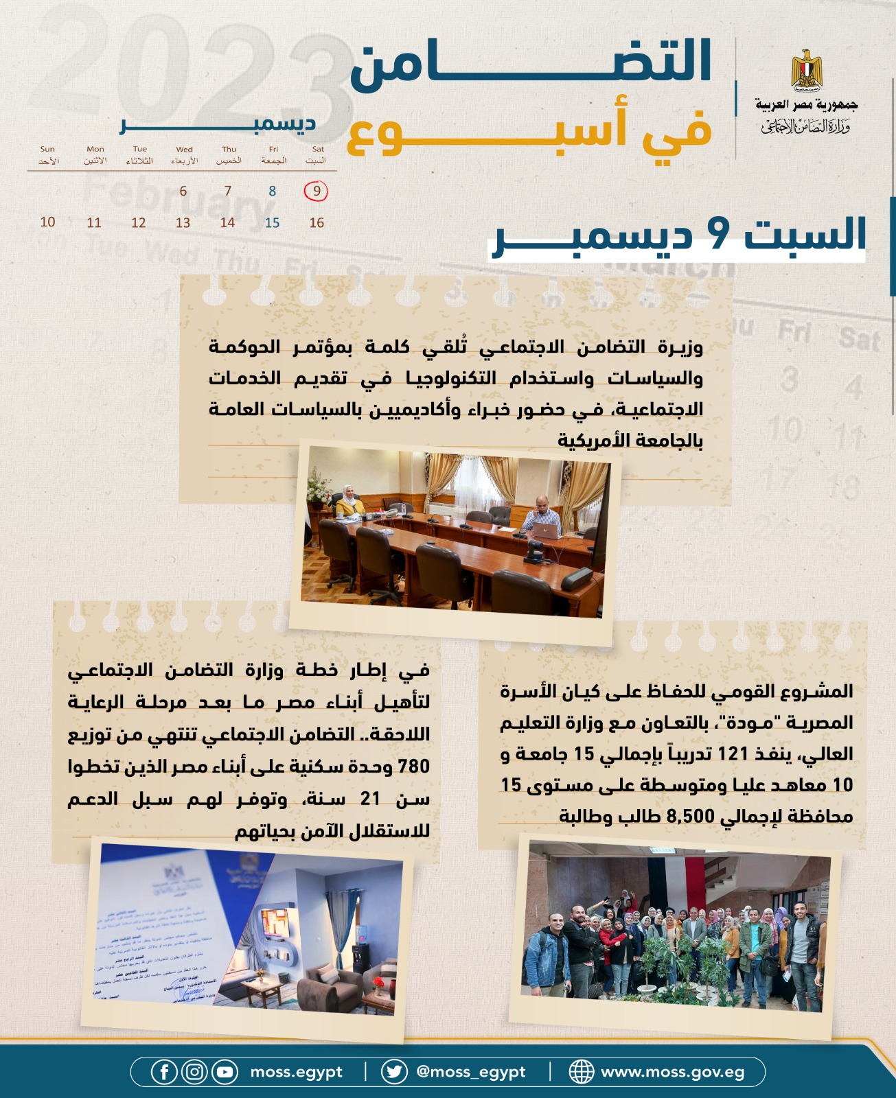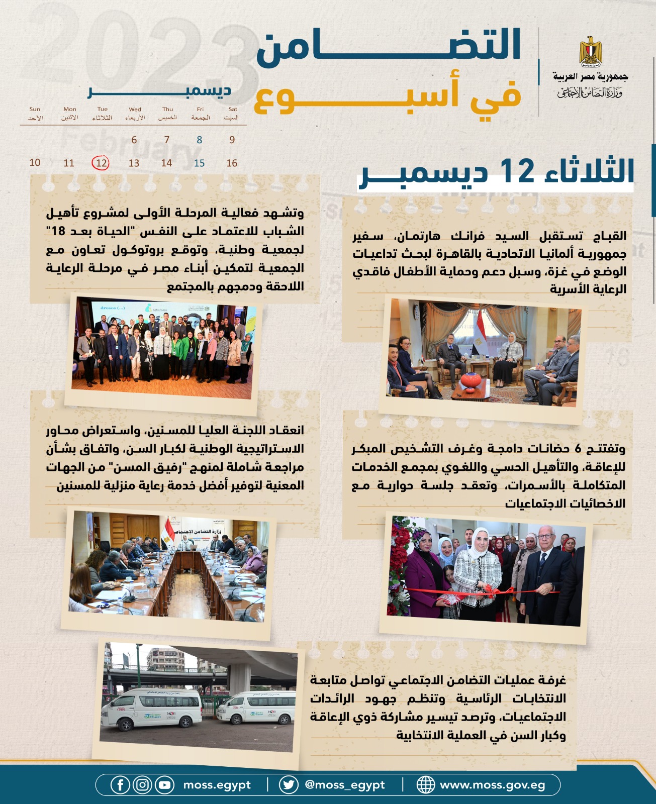 أصدرت وزارة التضامن الاجتماعي تقريرها الأسبوعي بالإنفوجراف والفيديو، حيث تستعرض من خلاله الأنشطة والأحداث، التي قامت بها السيدة نيفين القباج وزيرة التضامن الاجتماعي، وكذلك قطاعات الوزارة المختلفة خلال الفترة من 8 ديسمبر إلى 14 ديسمبر 2023 ونستعرض أبرزها في التقرير التالي: