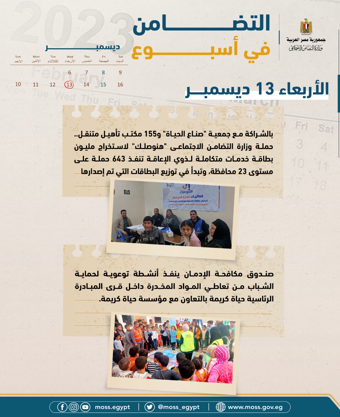 - بالشراكة مع جمعية "صناع الحياة"، و155 مكتب تأهيل متنقل، حملة وزارة التضامن الاجتماعي "هنوصلك" لاستخراج مليون بطاقة خدمات متكاملة لذوى الإعاقة تنفذ 643 حملة على مستوى 23 محافظة، وتبدأ في توزيع البطاقات التي تم إصدارها.