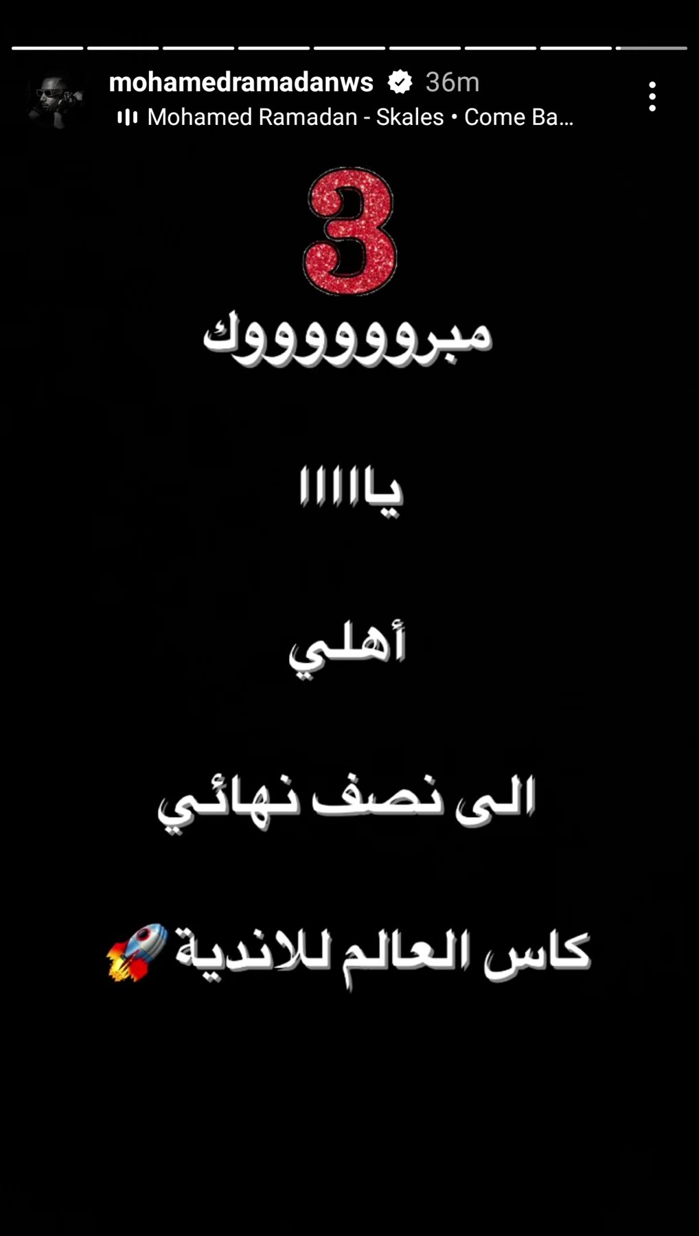 نشر محمد رمضان ستوري على صفحته الرسمية عبر موقع تبادل الصور والفيديوهات " إنستجرام " وعلق قائلا " مبروك يا أهلي .. إلى نصف نهائي كاس العالم للأندية " .