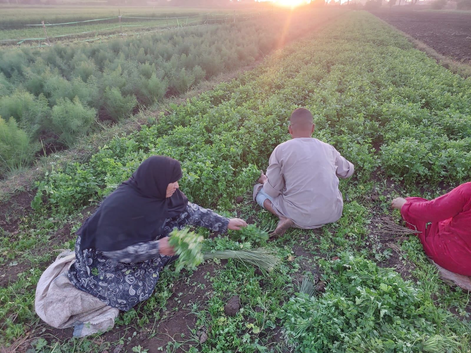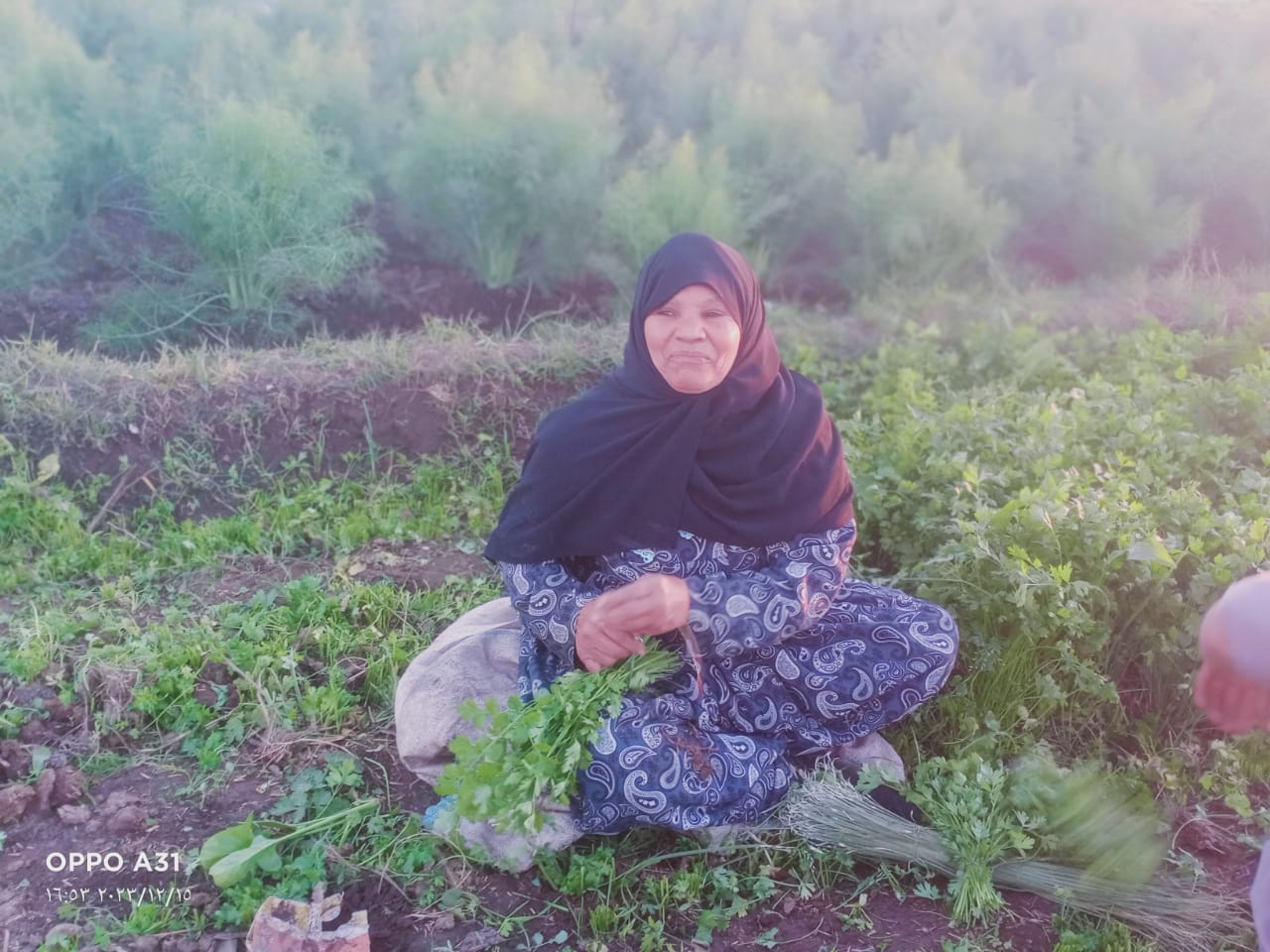"دلال عبد الحكيم" سيدة مسنة صاحبة الـ62 عام، الشهيرة بأم أحمد المزراعة بمحافظة المنيا، وتتواجد باحدى الأراضى الزراعية هى وزوجات أولادها، لجنى محصول" البقدونس"، من إحدى الأراضى الزراعية بجزيرة بنى أحمد الشرقية، بمركز المنيا.