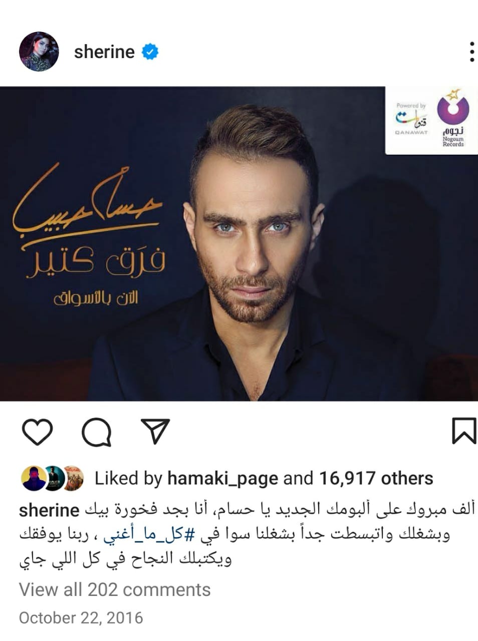 قامت شيرين عبد الوهاب، بحذف جميع الصور على مواقع تبادل الصور والفيديوهات “إنستجرام” ما عدا صورتين الأولى أثناء نشر صورة له لتروجها لبرنامجها “إستوديو شيرين” وقت إستضافته، والثانية بوستر ألبوم حسام حبيب "فرق كتير" فى عام 2016، وذلك وقت علاقتهم كأصدقاء.