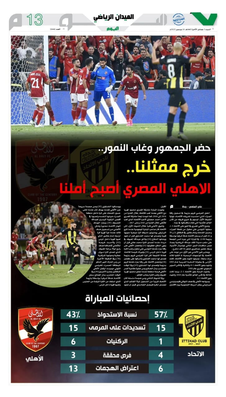 فيما خرجت صحيفة "الميدان الرياضي" بعنوان "حضر الجمهور وغاب النمور"، مُضيفة: "خرج ممثلنا.. والأهلي المصري أصبح أملنا".