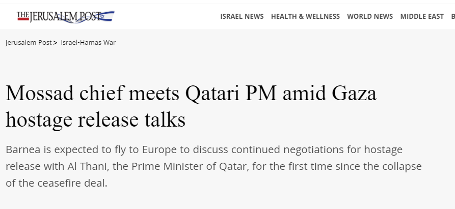 قالت صحيفة جيروزاليم بوست ، إن هناك مباحثات مرتقبة بين مسؤولون إسرائيليون وقطريون اليوم السبت ، في إطار جهود لإحياء محادثات بخصوص الإفراج عن رهائن محتجزين في غزة مقابل وقف إطلاق النار وتحرير سجناء فلسطينيين تحتجزهم إسرائيل