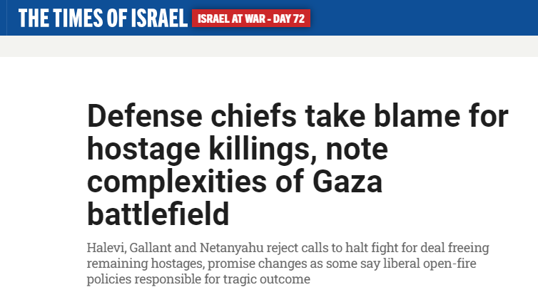 كشفت صحيفة تايمز اوف اسرائيل ان قادة الدفاع الإسرائيليون يتحملوا المسؤولية عن القتل العرضي لثلاث رهائن كانوا يحاولون الهروب من الأسر في غزة، وتعهدوا باتخاذ خطوات لضمان عدم تكرار الحادث المأساوي، لكنهم أشاروا أيضا إلى الصعوبات التي يواجهها الجنود في ساحات القتال الحضرية “المعقدة” في غزة.