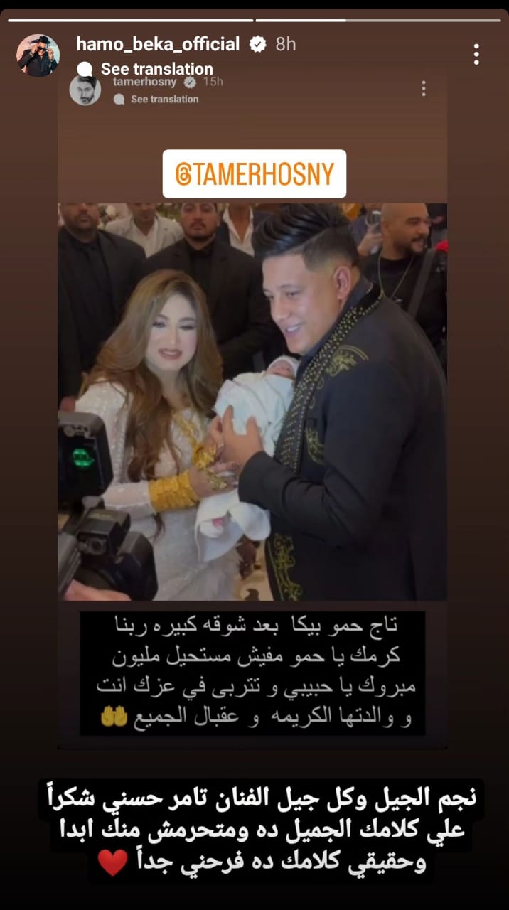 وكتب تامر حسني:" تاج حمو بيكا.. بعد شوقة كبيرة ربنا كرمك ياحمو.. مفيش مستحيل.. مليون مبروك يا حبيبي وتتربى في عزك انت ووالدتها الكريمة وعقبال الجميع".