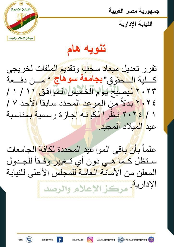 قررت النيابة الإدارية تعديل ميعاد سحب وتقديم الملفات لخريجي كلية الحقوق "بجامعة سوهاج" من دفعة 2023 ليصبح يوم الخميس الموافق 11 / 1/ 2024 بدلاً من الموعد المحدد سابقاً الأحد7 / 1 / 2024 نظًرا لكونه إجازة رسمية بمناسبة عيد الميلاد المجيد.