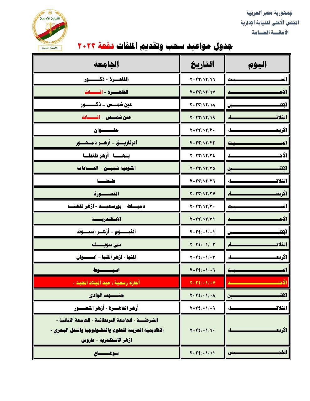 علماً بأن باقي المواعيد المحددة لكافة الجامعات ستظل كما هي دون أي تغيير وفقاً للجدول المعلن من الأمانة العامة للمجلس الأعلى للنيابة الإدارية.