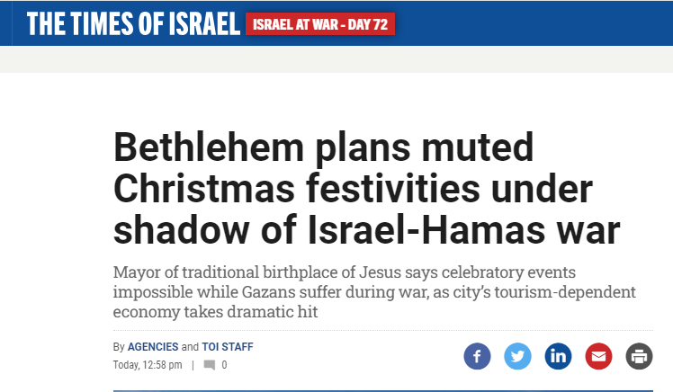 ذكرت صحيفة تايمز اوف اسرئيل أن احتفالات مدينة بيت لحم هذا العام بأعياد الميلاد في ساحة كنيسة المهد ستكون الاحتفالات مختصرة "بدون ضجة ودون الكثير من الأضواء" في ظل الحرب الدائرة في غزة.