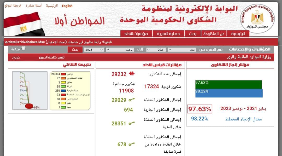 وأضاف سيادته أن مؤشر إنجاز الشكاوى بوزارة الموارد المائية والرى بمنظومة الشكاوى الحكومية الموحدة بمجلس الوزراء أوضح أن نسبة تنفيذ الشكاوى خلال الفترة من يناير ٢٠٢١ حتى نهاية شهر نوفمبر ٢٠٢٣ بلغت (٩٧.٦٠ %) ، وإنتهت الوزارة من بحث ودراسة عدد (١٦٣٣) شكوي وطلب وإستغاثة خلال شهر نوفمبر ٢٠٢٣ .