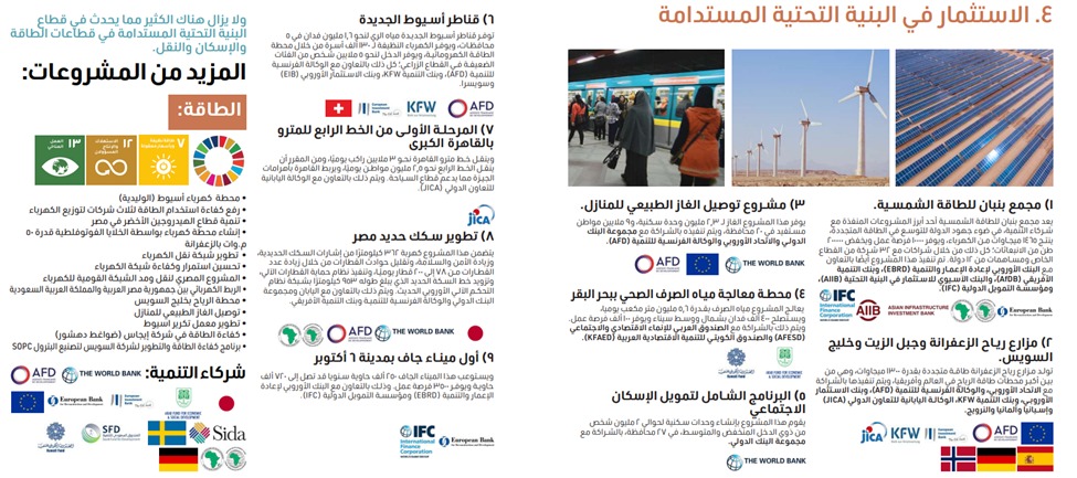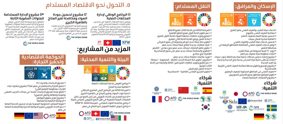 ووفقًا للتقرير فإن تلك التمويلات تم توجيهها للعديد من القطاعات ذات الأولوية تعزيزًا للجهود التي تقوم بها الدولة لتنفيذ المشروعات التنموية الكُبرى، تنفيذًا لأهداف التنمية المستدامة؛ ويأتي على رأسها قطاع النقل المستدام الذي شهد توقيع اتفاقيات تمويل تنموي بقيمة 7.29 مليار دولار، من شركاء التنمية (البنك الأوروبي لإعادة الإعمار والتنمية، والبنك الدولي، والوكالة الفرنسية للتنمية، وإسبانيا، وبنك الاستثمار الأوروبي، وكوريا الجنوبية، والصندوق الكويتي للتنمية، وبنك التنمية الأفريقي، والصين، والنمسا، والبنك الآسيوي للاستثمار في البنية التحتية، واليابان). وتعزز تلك التمويلات تنفيذ أهداف التنمية المستدامة على رأسها الهدف التاسع المتعلق بالصناعة والابتكار والبنية التحتية، والهدف الحادي عشر الذي يعزز المدن والمجتمعات المحلية والمستدامة.