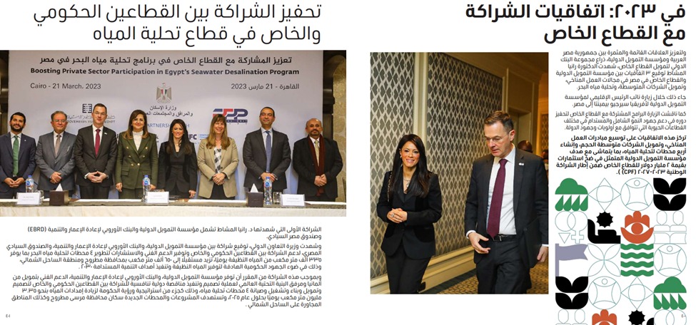 وتم توقيع شراكة بين مؤسسة التمويل الدولية، والبنك الأوروبي لإعادة الإعمار والتنمية (EBRD)، وصندوق مصر السيادي، لدعم الشراكة بين القطاعين الحكومي والخاص وتوفير الدعم الفني والاستشارات لتطوير ٤ محطات لتحلية مياه البحر بما يوفر 335 ألف متر مكعب من المياه النظيفة يوميًا، تزيد مستقبلًا إلى ٦٥٠ ألف متر مكعب بمحافظة مطروح ومنطقة الساحل الشمالي، وذلك في ضوء الجهود الحكومية الهادفة لتوفير المياه النظيفة وتنفيذ أهداف التنمية المستدامة 2023.