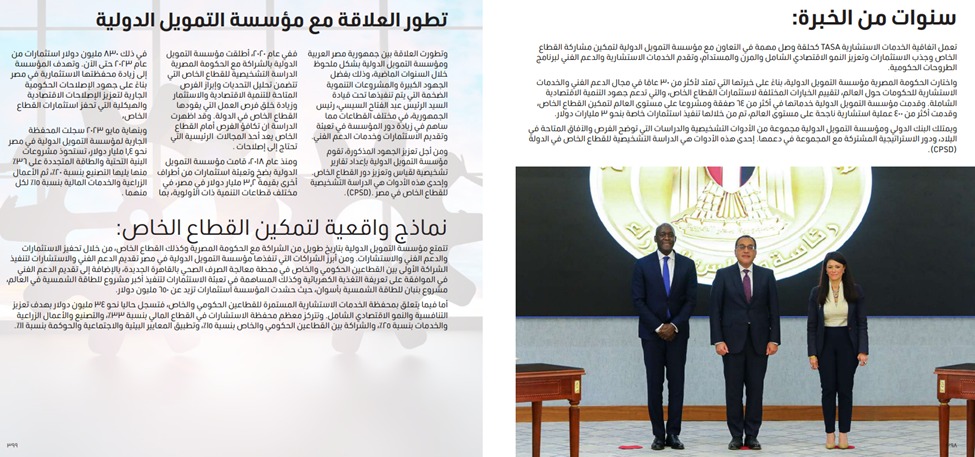 خلال العام الجاري شهد د. مصطفى مدبولي، رئيس مجلس الوزراء، توقيع اتفاقية الخدمات الاستشارية، والتي تم بموجبها تعيين مؤسسة التمويل الدولية كمستشار استراتيجي لبرنامج الطروحات الحكومية، ووقعها من مصر د. رانيا المشاط، وزيرة التعاون الدولي، ومختار ديوب، المدير العام لمؤسسة التمويل الدولية؛ ووفقًا للاتفاقية تقوم مؤسسة التمويل الدولية (IFC)، بتقديم الدعم والمشورة الفنية لبرنامج الطروحات الحكومية، والمساعدة في هيكلة وإعداد الشركات المستهدف طرحها للقطاع الخاص، وتحسين حوكمة الشركات، بما يعزز التدفقات الرأسمالية ويدعم رؤية الدولة لتحقيق التعافي الاقتصادي.
