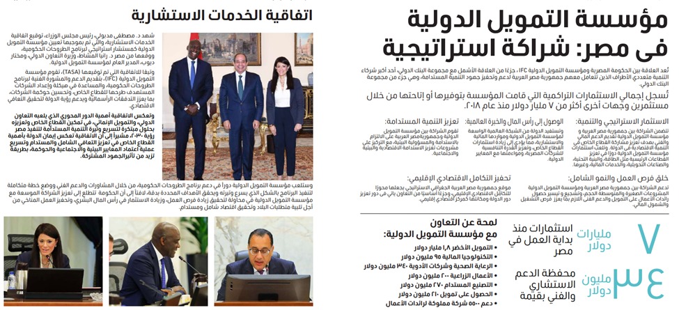 ولتعزيز العلاقات القائمة والمثمرة بين جمهورية مصر العربية ومؤسسة التمويل الدولية، ذراع مجموعة البنك الدولي لتمويل القطاع الخاص، شهدت الدكتورة رانيا المشاط توقيع 3 اتفاقيات بين مؤسسة التمويل الدولية والقطاع الخاص في مصر في مجالات العمل المناخي، وتمويل الشركات المتوسطة، وتحلية مياه البحر، وذلك خلال زيارة نائب الرئيس الإقليمي لمؤسسة التمويل الدولية لأفريقيا سيرجيو بيمينتا إلى مصر.