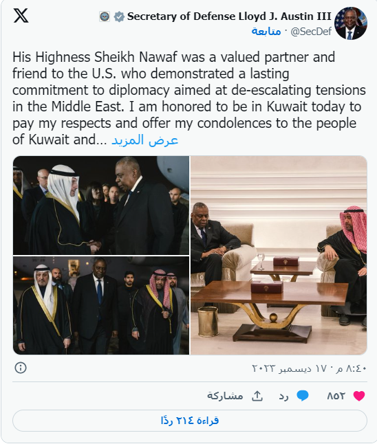 وقال إن "أوستن أفاد بأن أن الرئيس بايدن طلب منه قيادة الوفد الأمريكي إلى الكويت للحداد مع الشعب الكويتي والتعبير عن التقدير للإرث القوي الذي تركه الشيخ نواف وراءه. وأعرب عن رغبته في تعزيز الشراكة الدفاعية وتعميقها".