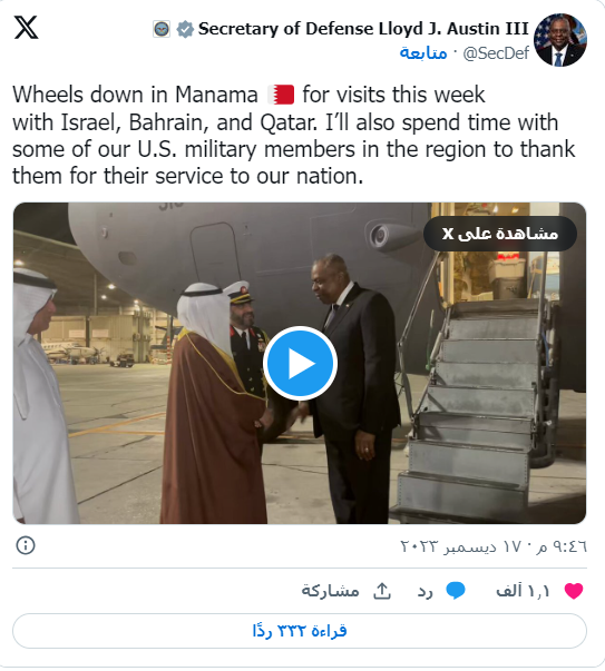 وفي منشور آخر، كتب أوستن: "وصلنا إلى المنامة.. الزيارات هذا الأسبوع تشمل إسرائيل والبحرين وقطر. وسأقضي أيضا بعض الوقت مع بعض أفراد الجيش الأمريكي في المنطقة لأشكرهم على خدمتهم لأمتنا".
