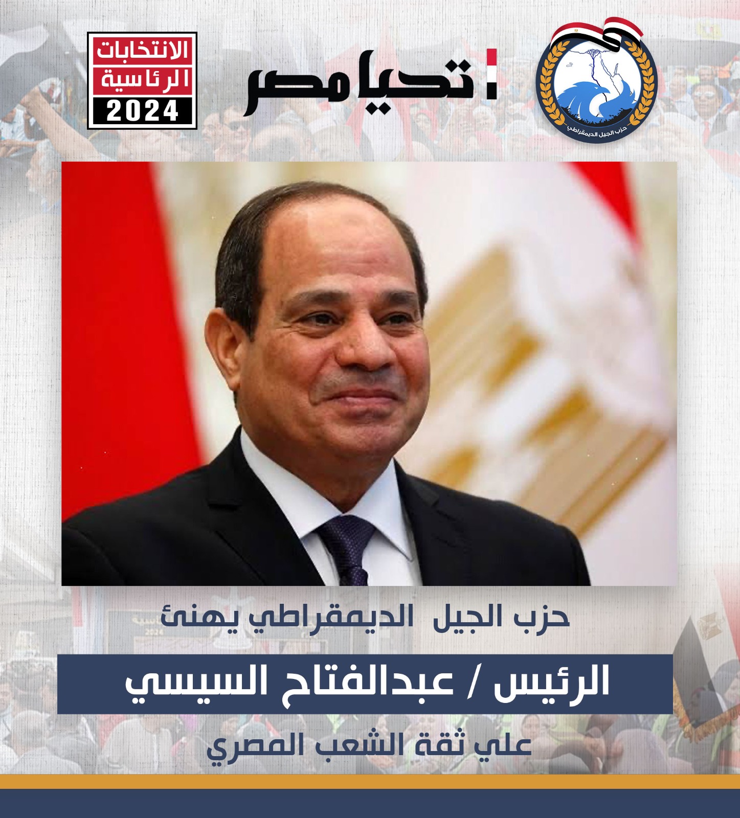 هنئ حزب الجيل الديمقراطي الرئيس عبد الفتاح السيسي بفوزة بثقة جماهير شعب مصر العظيم، التي اثبتت من خلالها اقبالها الكبير والغير مسبوق على صناديق الانتخاب، إن الشعب المصري يعى حجم التحديات التي يواجهها الوطن، وأن المصريين اختاروا طريق الجمهورية الجديدة من خلال هذه الانتخابات التاريخية والفارقة .