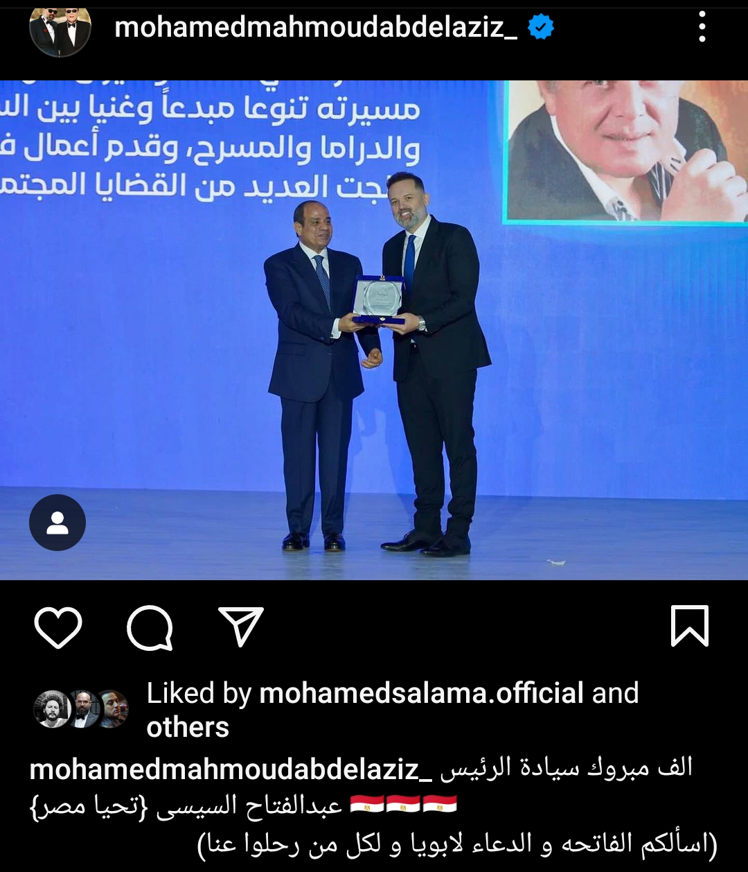 أعرب الفنان محمد محمود عبد العزيز عن سعادته بفوز الرئيس السيسي وذلك من خلال نشره لصورة تجمعه مع الرئيس السيسي على صفحته الرسمية عبر موقع تبادل الصور والفيديوهات " إنستجرام " وعلق قائلا " ألف مبروك سيادة الرئيس عبد الفتاح السيسي .. تحيا مصر " .
