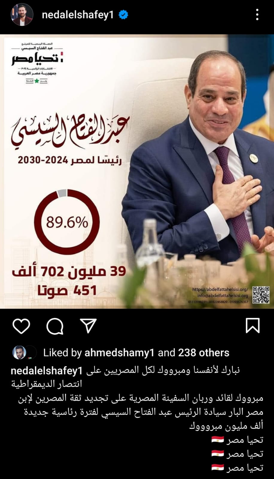 حرص عدد من نجوم الفن على تهنئة الرئيس السيسي بفوزه بالانتخابات الرئاسية وتوليه ولاية رئاسية ثالثة تمتد إلى عام 2030 وذلك بعد الإعلان عن نتيجة الانتخابات الرئاسية اليوم .