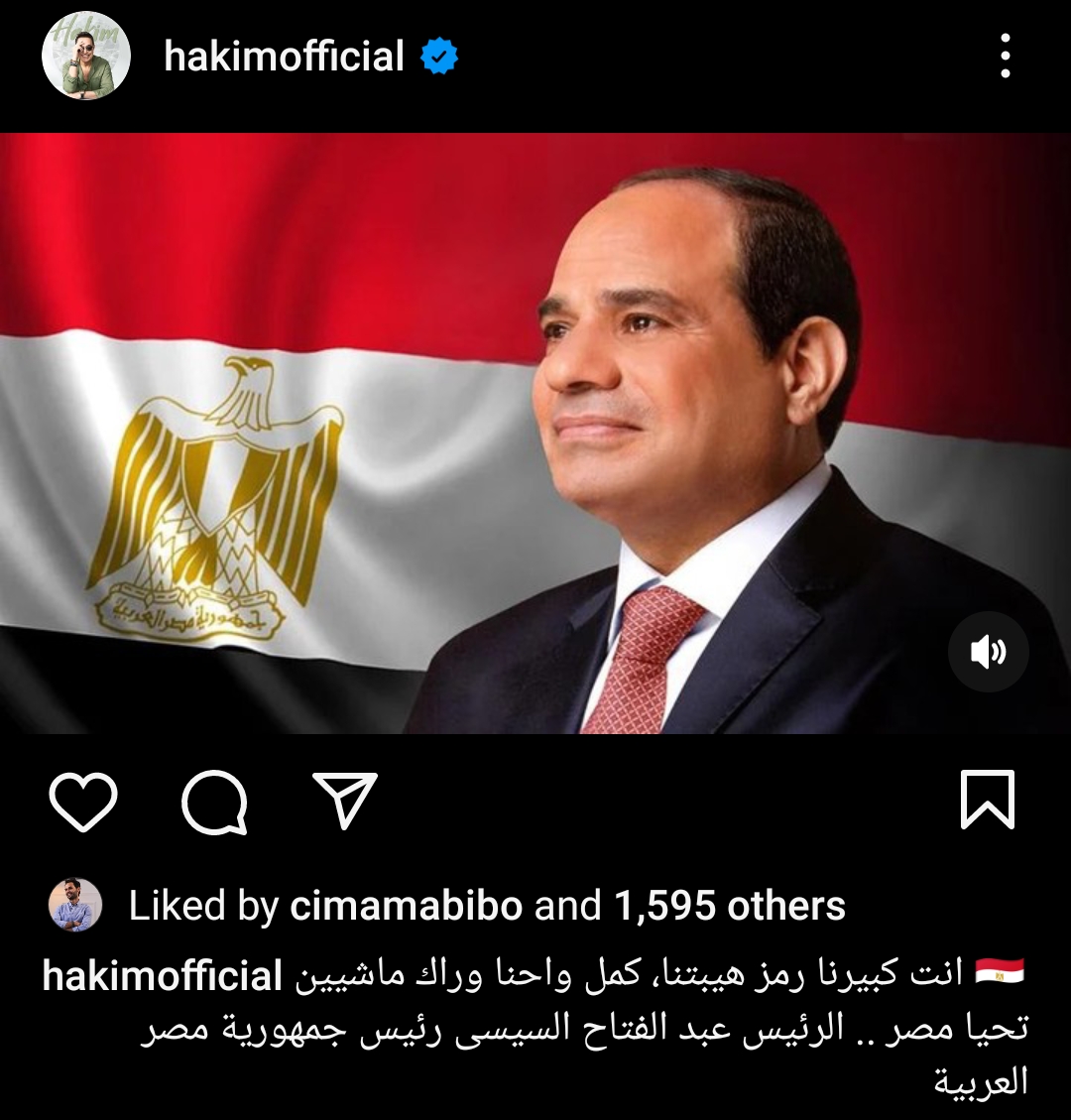 كما نشر حكيم صورة الرئيس السيسي على صفحته الرسمية عبر موقع تبادل الصور والفيديوهات " إنستجرام " وعلق قائلا " أنت كبيرنا رمز هيبتنا .. كمل واحنا وراك ماشيين، تحيا مصر .. الرئيس عبد الفتاح السيسي رئيس جمهورية مصر العربية " .