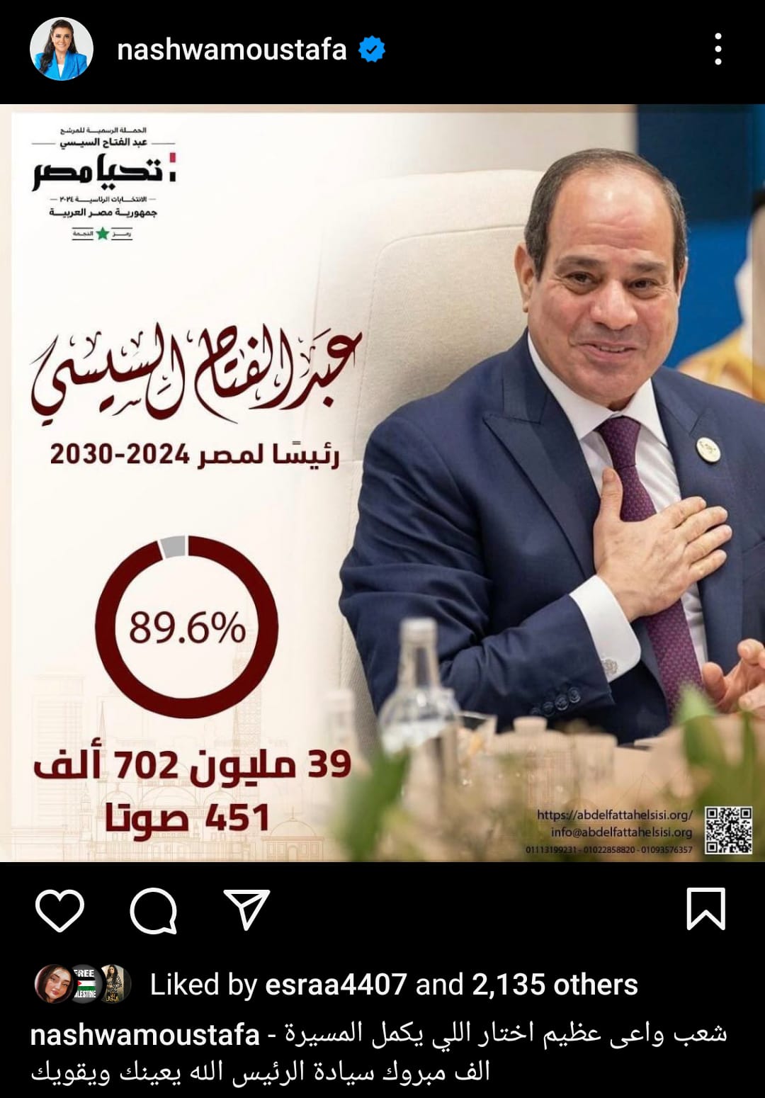 عبرت الفنانة نشوى مصطفى عن سعادتها بفوز الرئيس السيسي وذلك عندما نشرت صورة الرئيس السيسي على صفحتها الرسمية عبر موقع تبادل الصور والفيديوهات إنستجرام وعلقت قائلة شعب واعي عظيم اختار اللي يكمل المسيرة .. ألف مبروك سيادة الرئيس الله يعينك ويقويك .