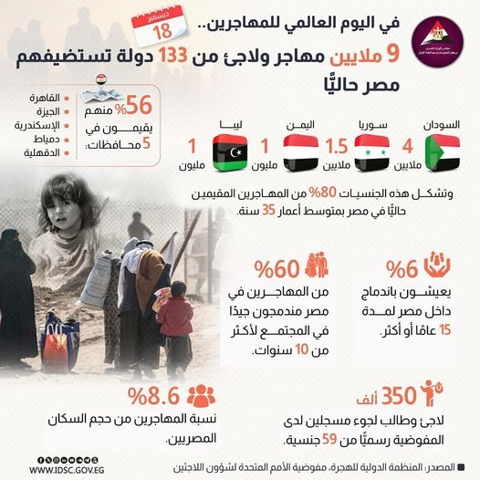 احتفل العالم باليوم العالمى للمهاجرين الذى يوافق 18 ديسمبر ، ووفقًا للمنظمة الدولية للهجرة فإن العدد الحالي للمهاجرين الدوليين المقيمين في مصر وصل إلى 9 ملايين مهاجر ولاجئ.