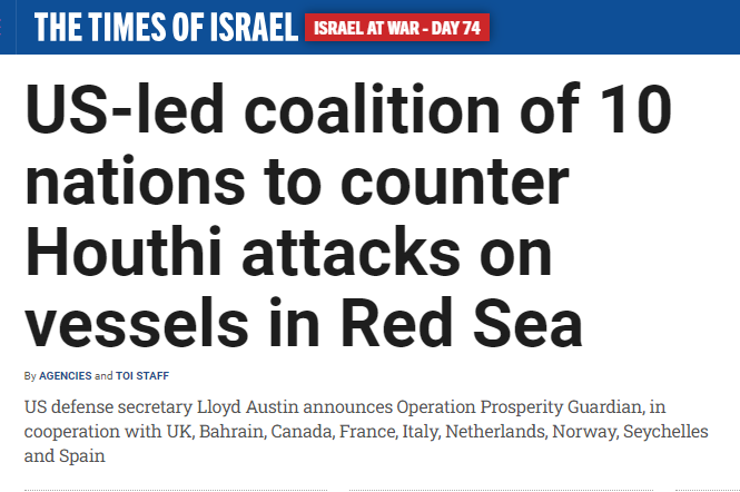 أعلن وزير الدفاع الأمريكي لويد أوستن امس الإثنين تشكيل تحالف دولي يضمّ عشرة بلدان للتصدّي لهجمات الحوثيين المتكررة على سفن يعتبرونها "مرتبطة" بإسرائيل في البحر الأحمر.