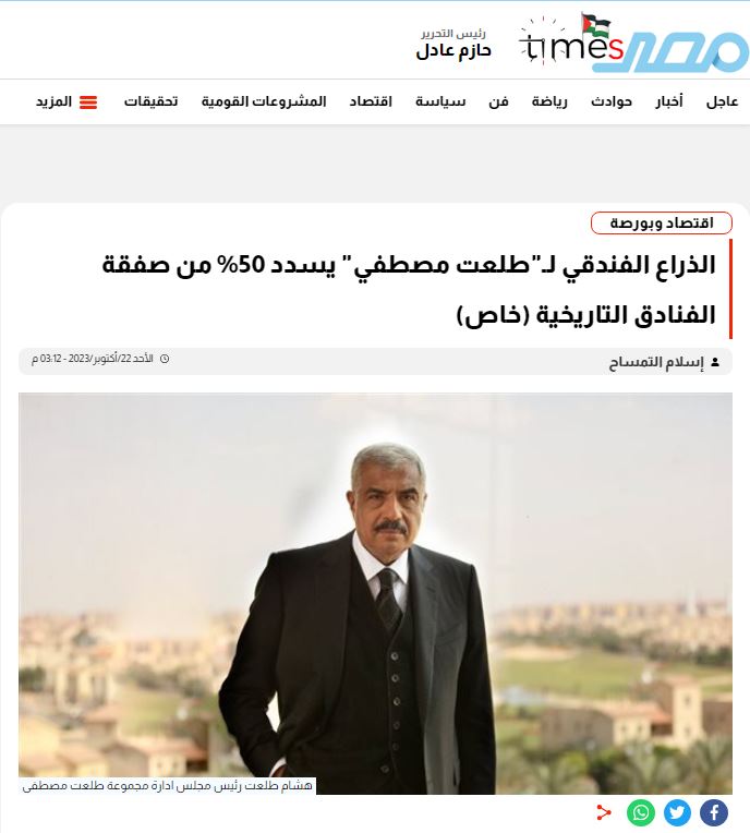 الحصة التي وُصفت بالمؤثرة قدمتها الشركة العربية للاستثمارات الفندقية والسياحية" ICON “، الذراع الفندقي لمجموعة طلعت مصطفي، أنها تقدمت بعرض للاستحواذ علي النسبة الأكبر بالشركة الحكومية المالكة، مجموعة طلعت مصطفى القابضة للعقارات والإنشاءات المصرية، في بيان لبورصة مصر يوم الأحد، إنها مستمرة في تنفيذ إجراءات صفقة استحواذ على الفنادق التاريخية بمصر، والمملوكة لـ”الشركة القابضة للسياحة والفنادق".