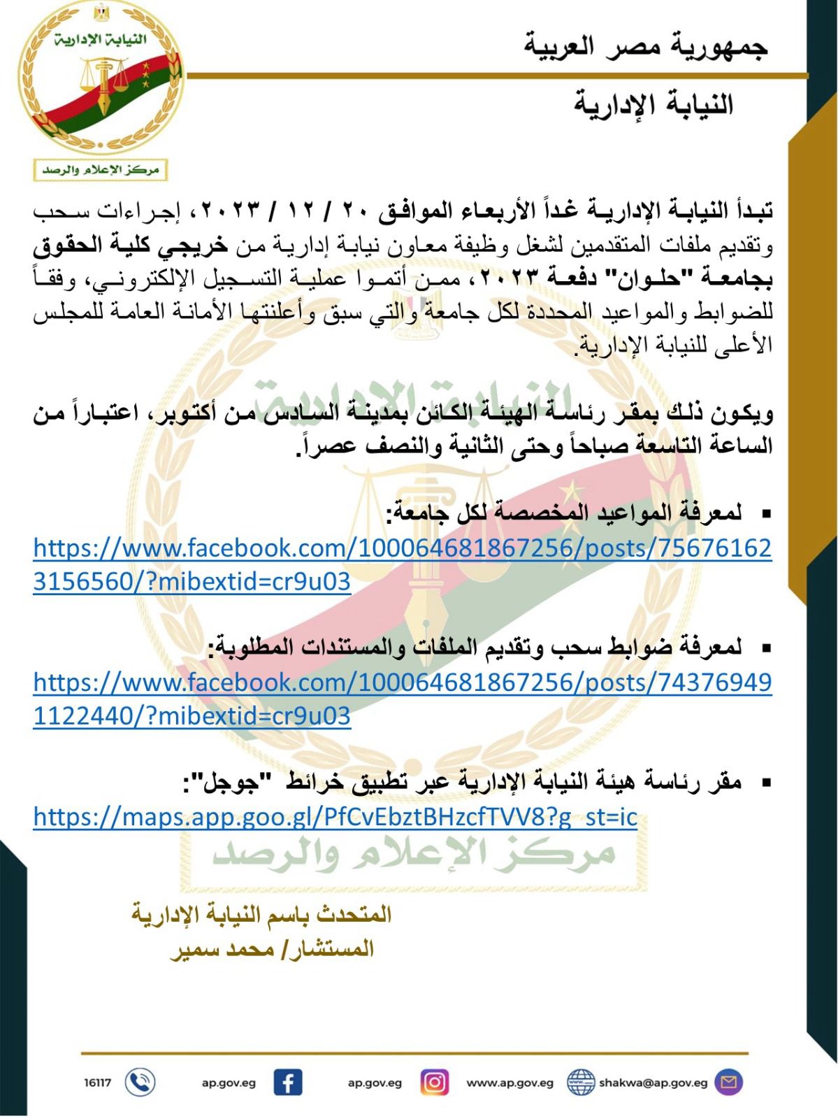 تبدأ النيابة الإدارية، غداً الأربعاء، إجراءات سحب وتقديم ملفات المتقدمين لشغل وظيفة معاون نيابة إدارية، من خريجي كلية الحقوق بجامعة "حلوان" دفعة 2023.