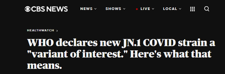 وصنفت منظمة الصحة العالمية المتحور الجديد JN.1 على أنه "مثير للاهتمام" منفصلاً عن السلالة الأم BA.2.86، وذلك بعد أن كان صُنِّف سابقاً على أنه جزء فرعي من تلك السلالة.
