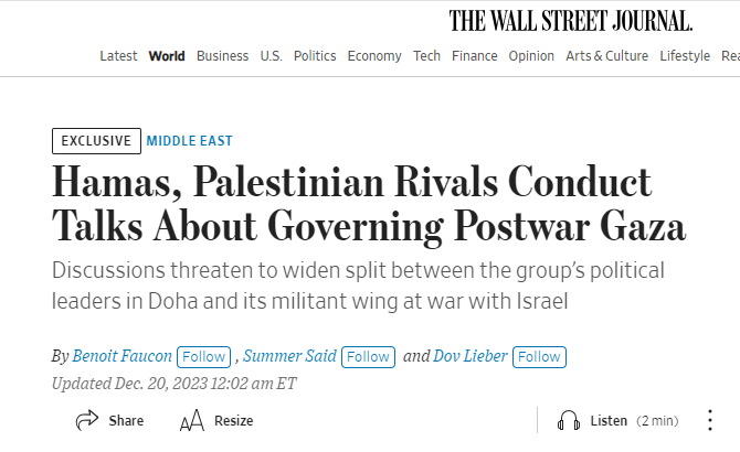 أفادت صحيفة "وول ستريت جورنال" Wall Street journal ، نقلا عن مصادر، أن قادة فتح وحماس يُجرون حاليا مناقشات حول حكم غزة والضفة الغربية بعد انتهاء الحرب.