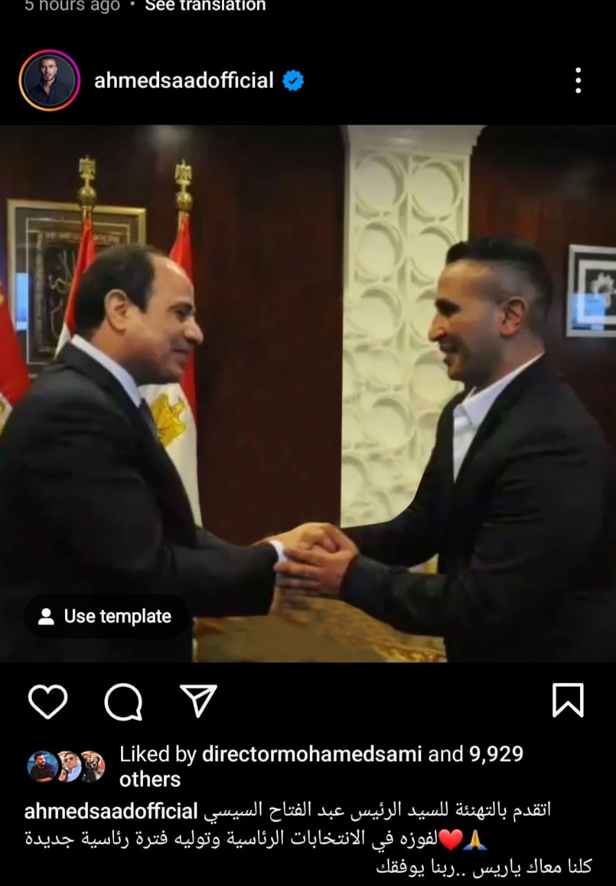 وشارك "سعد" جمهوره بصورة تجمعه مع الرئيس، وذلك عبر حسابه الخاص بموقع تبادل الصور والفيديوهات"انستجرام"، وكتب:"اتقدم بالتهنئة للسيد الرئيس عبدالفتاح السيسي لفوزه في الإنتخابات الرئاسية وتوليه فترة رئاسية جديدة كلنا معاك يا ريس ربنا يوفقك".