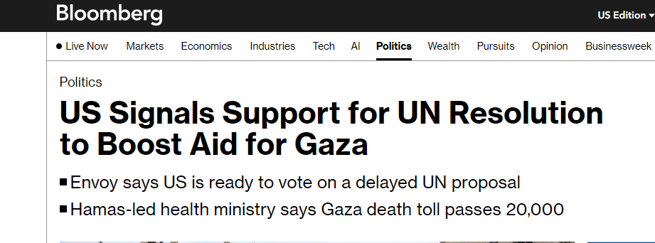 أفادت وكالة "بلومبرغ نيوز " بأن الولايات المتحدة قد تؤيد مشروع قرار مجلس الأمن الدولي حول تسهيل إيصال المساعدات الإنسانية لجميع أنحاء قطاع غزة.