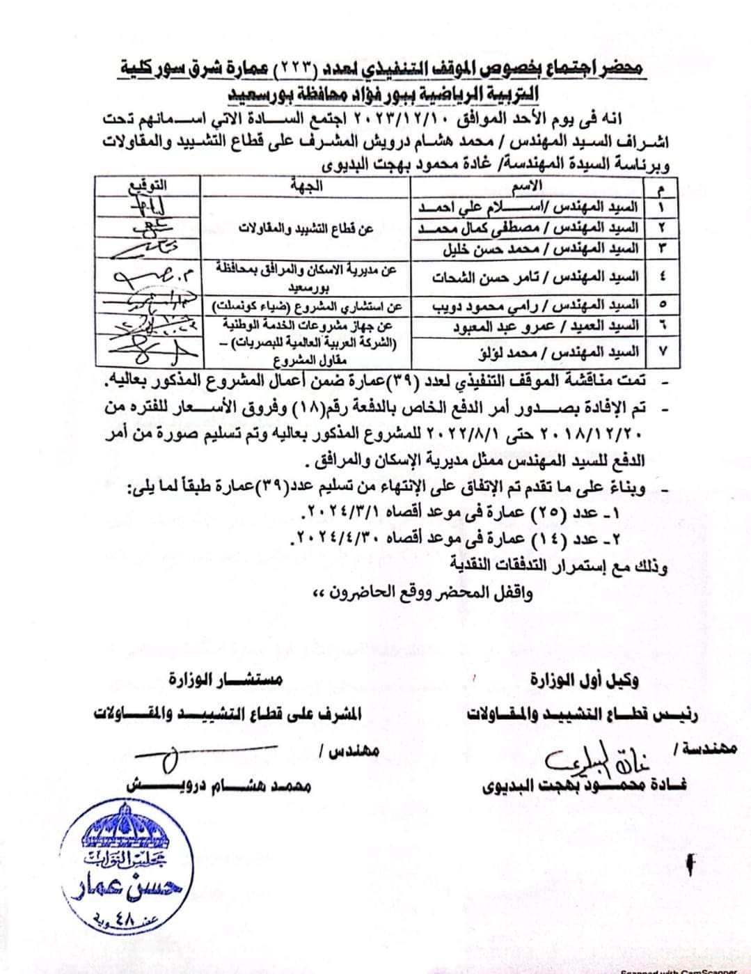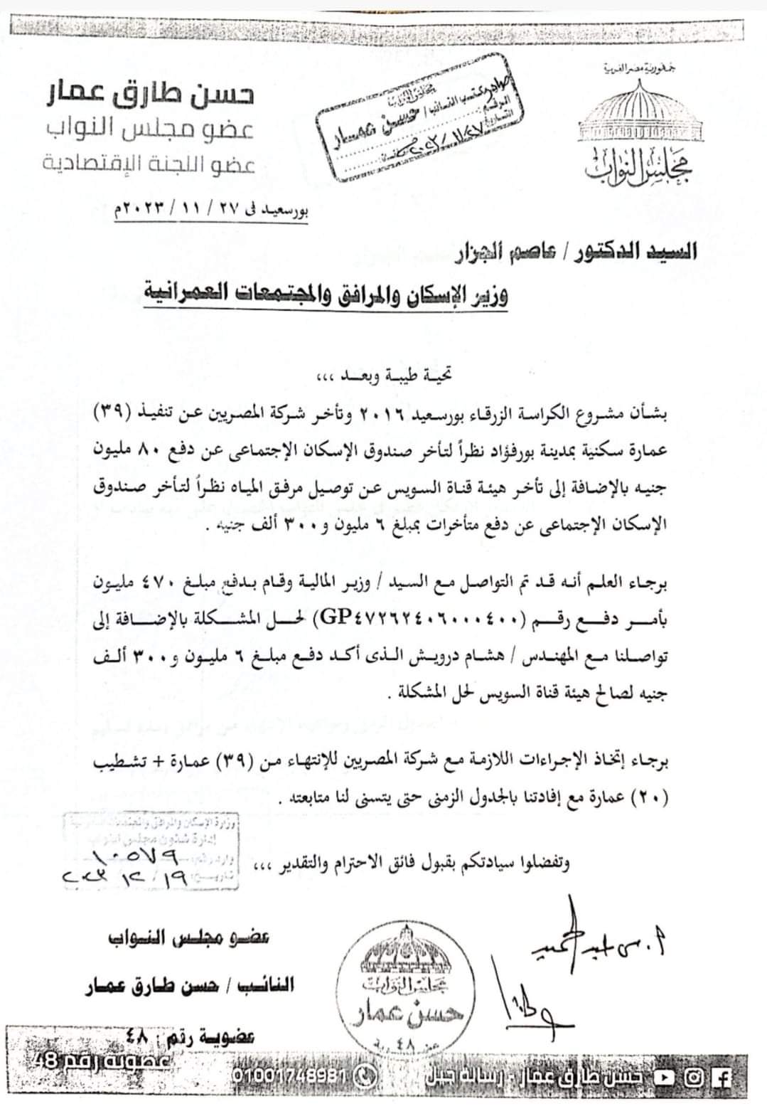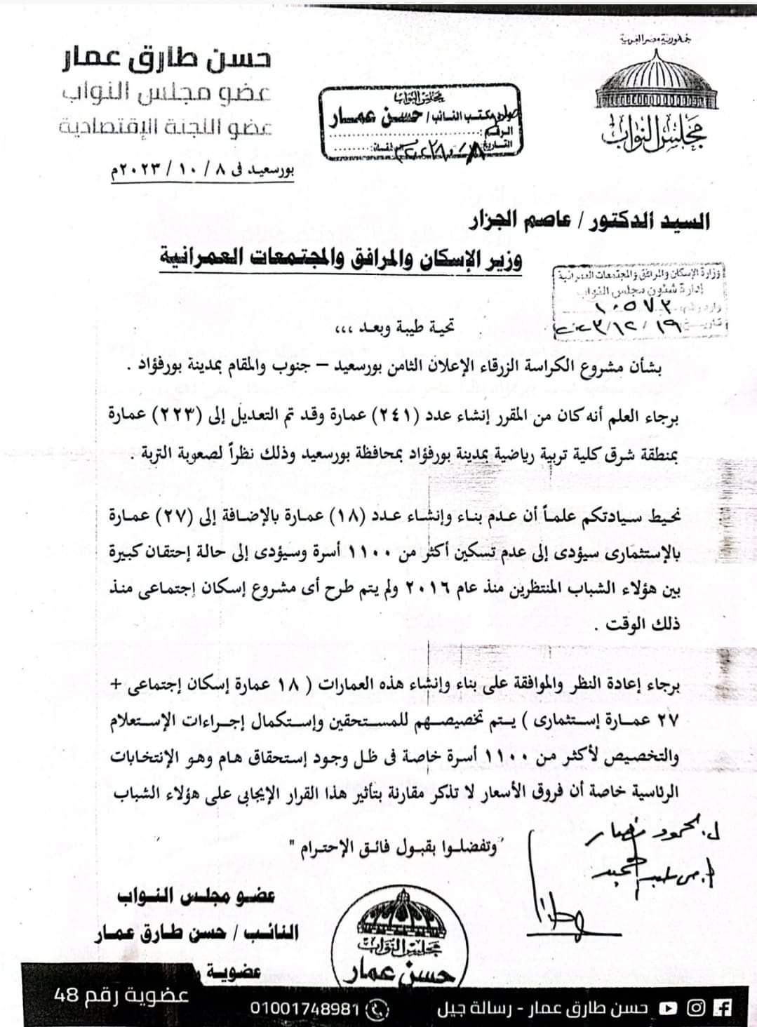 الكتلة البرلمانية تعلن تفاصيل لقاءها بوزير الإسكان لحل مشاكل شباب بورسعيد (مستندات)