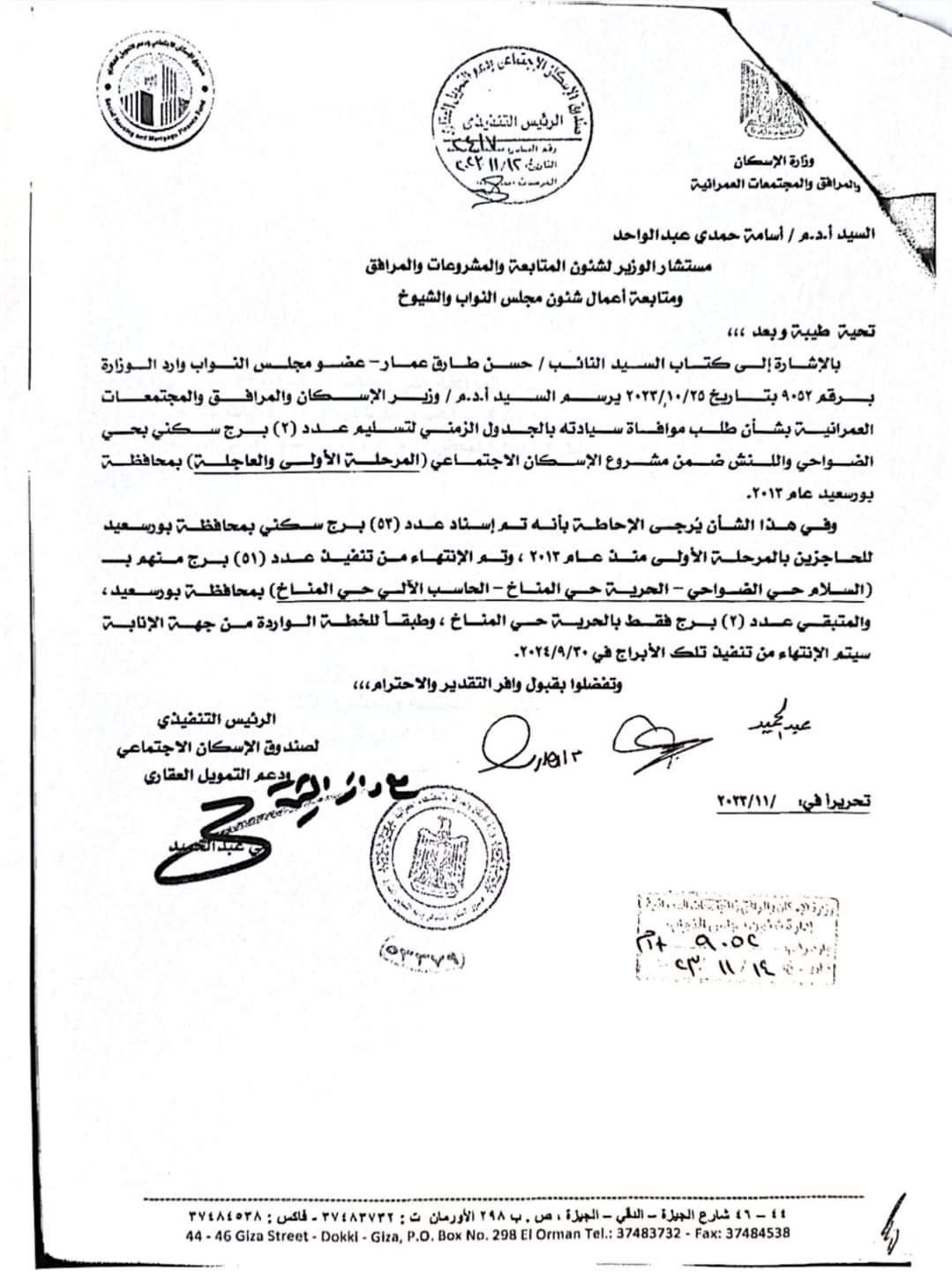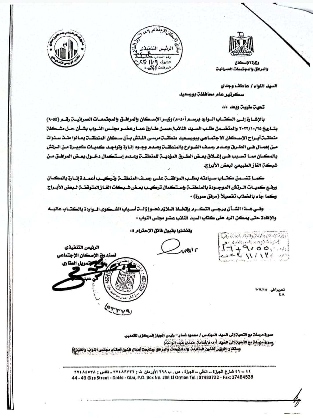وأشار أن مشكلة أبراج الإسكان الاجتماعى، تم التوجيه بتسليم الابراج التي تم اجراء القرعة عليها خلال اسبوعين مع سرعة الانتهاء من كافة التشطيبات والمرافق لجميع الابراج والتي تم تسليمها بالفعل، وبالنسبة لمشكلة الرتش تم التوجه بإرسال مخاطبة الى محافظة بورسعيد بسرعة ازاله الرتش الموجودة بمنطقة الابراج حيث تعد ازالة تلك المخلفات مسئولية محافظة بورسعيد، وبالنسبة للبرجين المتبقين تم التوجية بسرعة الانتهاء منهم خلال 16 شهر مع توجيه خطاب لشركة المحمودية في هذا الشأن.