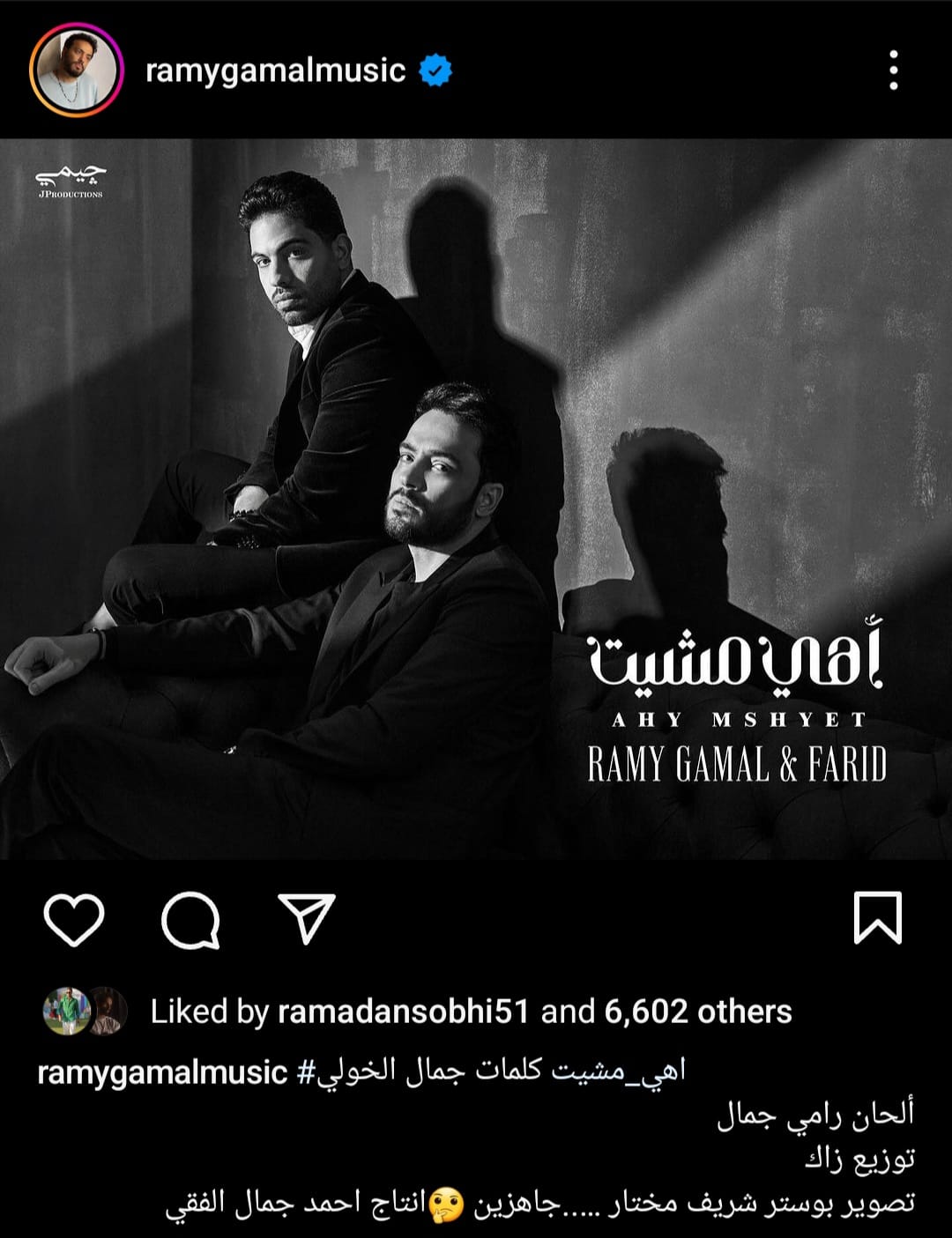 كتب "جمال" في المنشور:"أهي مشيت كلمات جمال الخولي، ألحان رامي جمال، توزيع زاك، وتصوير بوستر شريف مختار، جاهزين، إنتاج أحمد جمال الفقي".