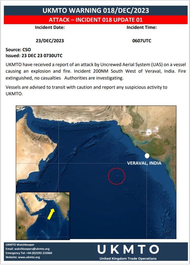 وقال المركز في بيان عبر "إكس" (تويتر سابقا): "تلقى مركز تنسيق التجارة البحرية في المملكة المتحدة التابع للبحرية البريطانية معلومات حول هجوم طائرة مسيرة على سفينة، ما أدى إلى وقوع انفجار ونشوب حريق، ووقعت الحادثة على بعد 200 ميل بحري جنوبي غرب مدينة فيراوال في الهند.